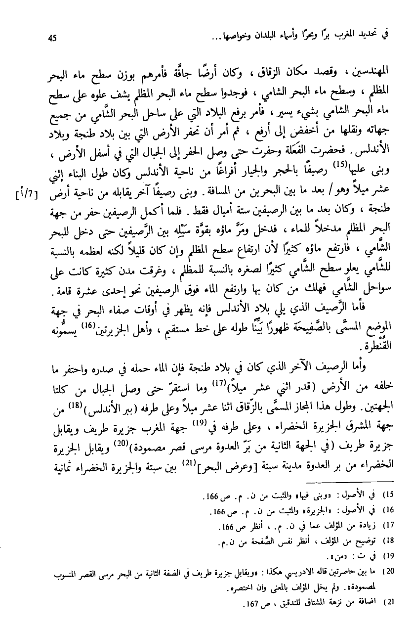 فأما الرّصيف الذي يلي بلاد الأندلس فإنه يظهر في أوقات صفاء البحر في جهة الموضع المسمّى بالصّفيحة ظهورا بيّنا طوله على خط مستقيم، وأهل الجزيرتين (¬16) يسمّونه القنطرة.