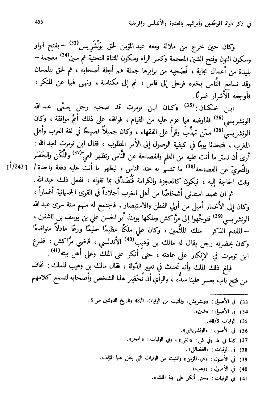 ابن خلكان: (¬35) «كان ابن تومرت قد صحبه رجل يسمّى عبد الله الونشريسي (36) ففاوضه فيما عزم عليه من القيام، فوافقه على ذلك أتمّ موافقة، وكان الونشريسي (¬36) ممّن تهذّب وقرأ على الفقهاء، وكان جميلا فصيحا في لغة العرب وأهل المغرب، فتحدثا يوما في كيفية الوصول إلى الأمر المطلوب، فقال ابن تومرت لعبد الله:
