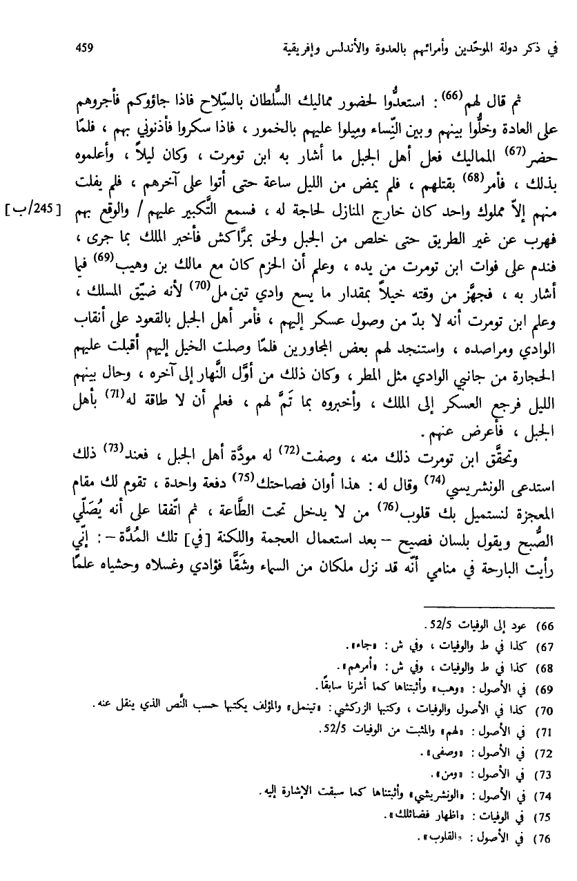 ثم قال لهم (¬66): استعدّوا لحضور مماليك السّلطان بالسّلاح فاذا جاؤوكم فأجروهم على العادة وخلّوا بينهم وبين النّساء وميلوا عليهم بالخمور، فاذا سكروا فأذنوني بهم، فلمّا حضر (¬67) المماليك فعل أهل الجبل ما أشار به ابن تومرت، وكان ليلا، وأعلموه بذلك، فأمر (¬68) بقتلهم، فلم يمض من الليل ساعة حتى أتوا على آخرهم، فلم يفلت منهم إلاّ مملوك واحد كان خارج المنازل لحاجة له، فسمع التّكبير عليهم / والوقع بهم فهرب عن غير الطريق حتى خلص من الجبل ولحق بمرّاكش فأخبر الملك بما جرى، فندم على فوات ابن تومرت من يده، وعلم أن الحزم كان مع مالك بن وهيب (¬69) فيما أشار به، فجهّز من وقته خيلا بمقدار ما يسع وادي تين مل (¬70) لأنه ضيّق المسلك، وعلم ابن تومرت أنه لا بدّ من وصول عسكر إليهم، فأمر أهل الجبل بالقعود على أنقاب الوادي ومراصده، واستنجد لهم بعض المجاورين فلمّا وصلت الخيل إليهم أقبلت عليهم الحجارة من جانبي الوادي مثل المطر، وكان ذلك من أوّل النّهار إلى آخره، وحال بينهم الليل فرجع العسكر إلى الملك، وأخبروه بما تمّ لهم، فعلم أن لا طاقة له (¬71) بأهل الجبل، فأعرض عنهم.