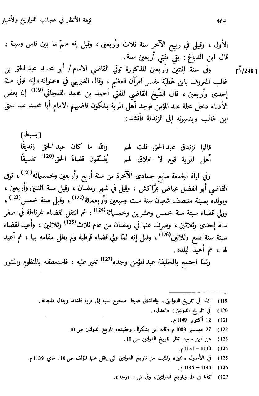 وفي سنة إثنتين وأربعين المذكورة توفي القاضي الامام / أبو محمد عبد الحق بن غالب المعروف بابن عطيّة مفسر القرآن العظيم، وقال الغبريني في «عنوانه» إنه توفي سنة إحدى وأربعين، قال الشّيخ القاضي المفتي أحمد بن محمد القلجاني (¬119) إن بعض الأدباء دخل محلة عبد المؤمن فوجد أهل المرية يشكون قاضيهم الامام أبا محمد عبد الحق ابن غالب وينسبونه إلى الزندقة فأنشد: