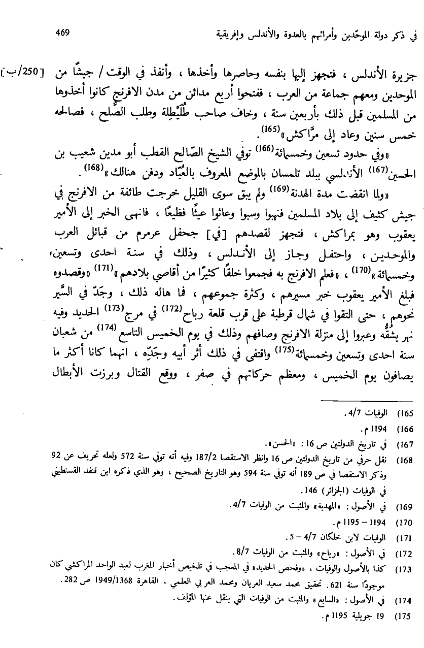 (¬168) نقل حرفي من تاريخ الدولتين ص: 16 وانظر الاستقصا 2/ 187 وفيه أنه توفي سنة 572 ولعله تحريف عن 92 وذكر الاستقصا في ص: 189 أنه توفي سنة 594 وهو التاريخ الصحيح، وهو الذي ذكره ابن قنفد القسنطيني في الوفيات (الجزائر) 146.
