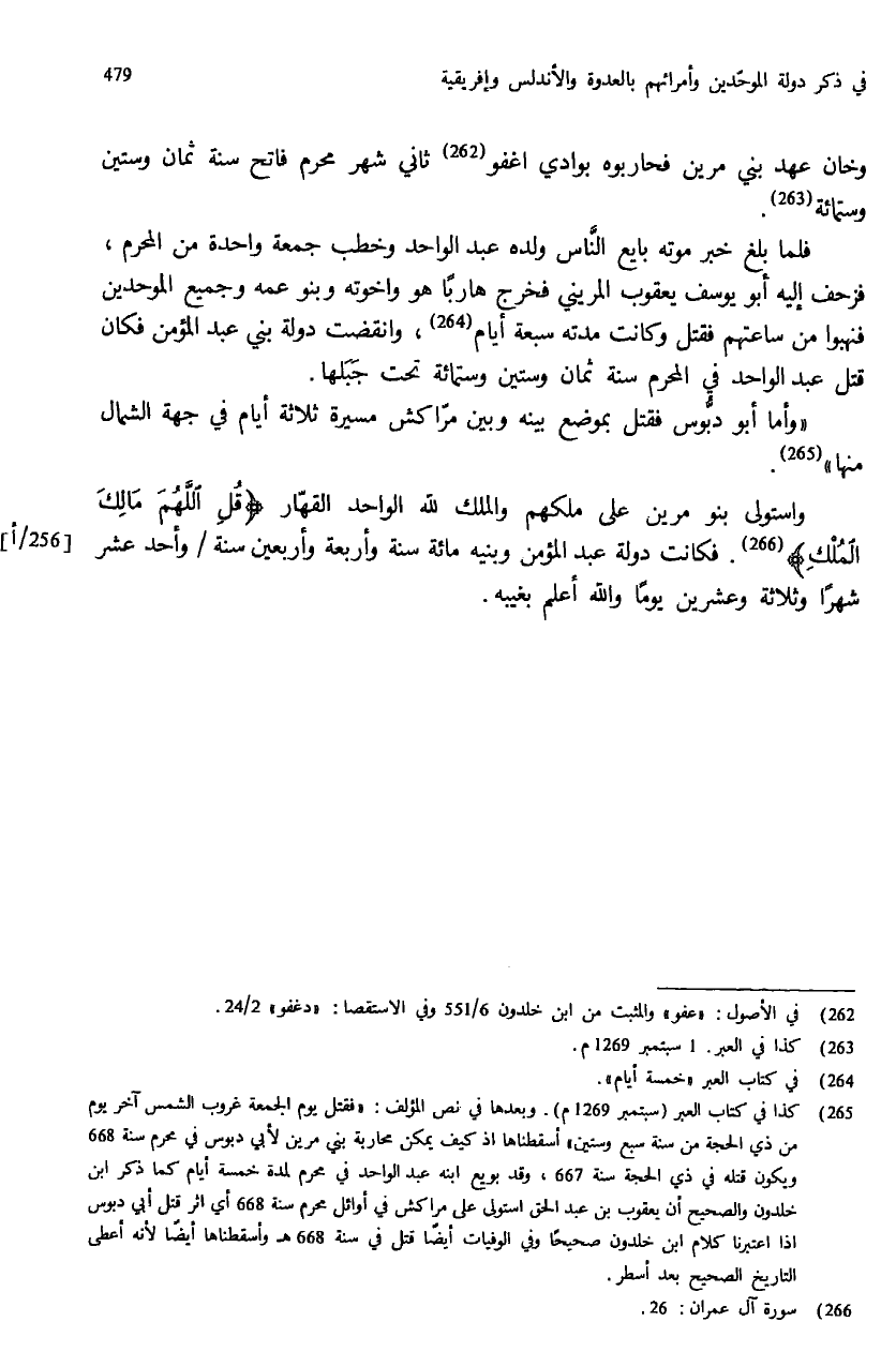 (¬265) كذا في كتاب العبر (سبتمبر 1269 م). وبعدها في نص المؤلف: «فقتل يوم الجمعة غروب الشمس آخر يوم من ذي الحجة من سنة سبع وستين» أسقطناها اذ كيف يمكن محاربة بني مرين لأبي دبوس في محرم سنة 668 ويكون قتله في ذي الحجة سنة 667، وقد بويع ابنه عبد الواحد في محرم لمدة خمسة أيام كما ذكر ابن خلدون والصحيح أن يعقوب بن عبد الحق استولى على مراكش في أوائل محرم سنة 668 أي اثر قتل أبي دبوس اذا اعتبرنا كلام ابن خلدون صحيحا وفي الوفيات أيضا قتل في سنة 668 هـ وأسقطناها أيضا لأنه أعطى التاريخ الصحيح بعد أسطر.