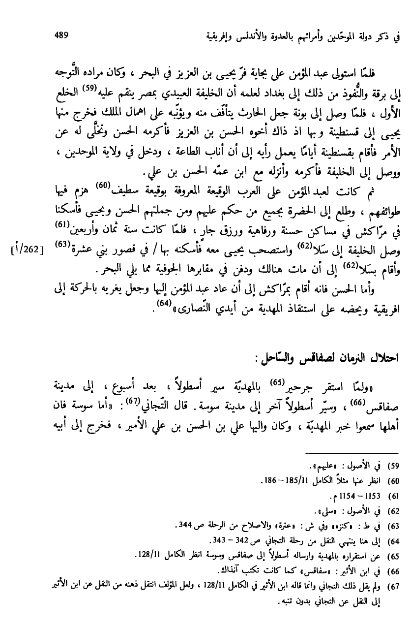 (¬65) عن استقراره بالمهدية وارساله أسطولا إلى صفاقس وسوسة انظر الكامل 11/ 128.