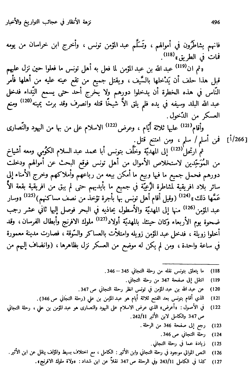 (¬126) النص الموالي موجود في رحلة التجاني وابن الأثير: الكامل، مع اختلاف بسيط والمؤلف ينقل عن ابن الأثير.