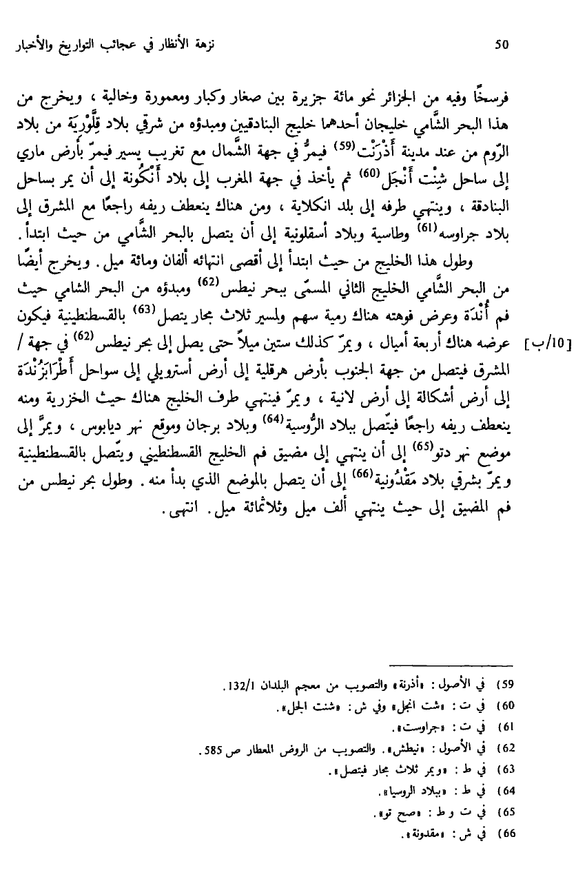 فرسخا وفيه من الجزائر نحو مائة جزيرة بين صغار وكبار ومعمورة وخالية، ويخرج من هذا البحر الشّامي خليجان أحدهما خليج البنادقيين ومبدؤه من شرقي بلاد قلّورية من بلاد الرّوم من عند مدينة أذرنت (¬59) فيمرّ في جهة الشّمال مع تغريب يسير فيمرّ بأرض ماري إلى ساحل شنت أنجل (¬60) ثم يأخذ في جهة المغرب إلى بلاد أنكونة إلى أن يمر بساحل البنادقة، وينتهي طرفه إلى بلد انكلاية، ومن هناك ينعطف ريفه راجعا مع المشرق إلى بلاد جراوسه (¬61) وطاسية وبلاد أسقلونية إلى أن يتصل بالبحر الشّامي من حيث ابتدأ.