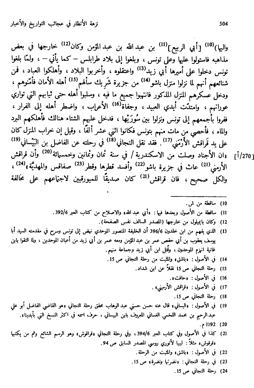 (¬21) كذا في الأصول وفي كتاب العبر 6/ 394، وفي رحلة التجاني «قراقوش» وهو الرسم الشائع وثم من يكتبها «قرقوش» مثلا: ليبيا لأتوري روسي المصدر السابق ص: 94.