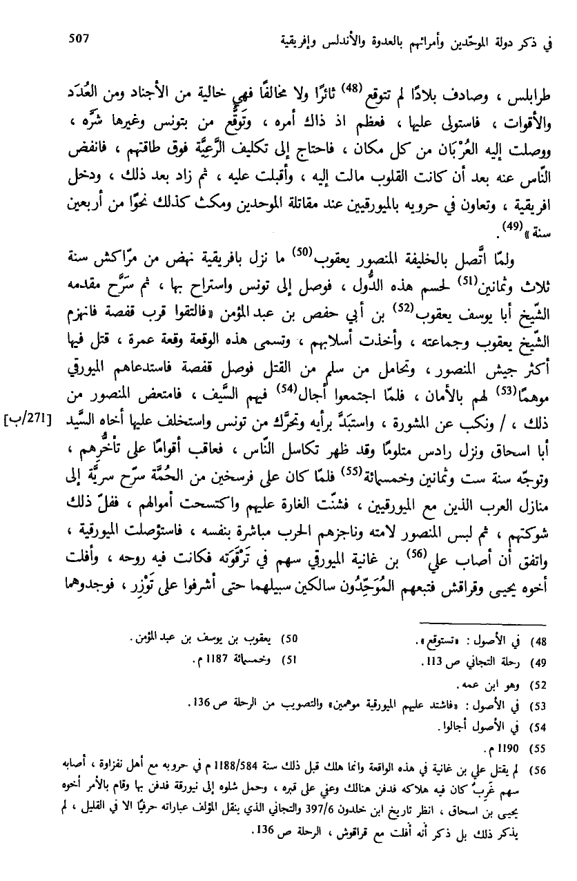 (¬56) لم يقتل علي بن غانية في هذه الواقعة وانما هلك قبل ذلك سنة 584/ 1188 م في حروبه مع أهل نفزاوة، أصابه سهم غرب كان فيه هلاكه فدفن هنالك وعفي على قبره، وحمل شلوه إلى نيورقة فدفن بها وقام بالأمر أخوه يحيى بن اسحاق، انظر تاريخ ابن خلدون 6/ 397 والتجاني الذي ينقل المؤلف عباراته حرفيا الا في القليل، لم يذكر ذلك بل ذكر أنه أفلت مع قراقوش، الرحلة ص: 136.
