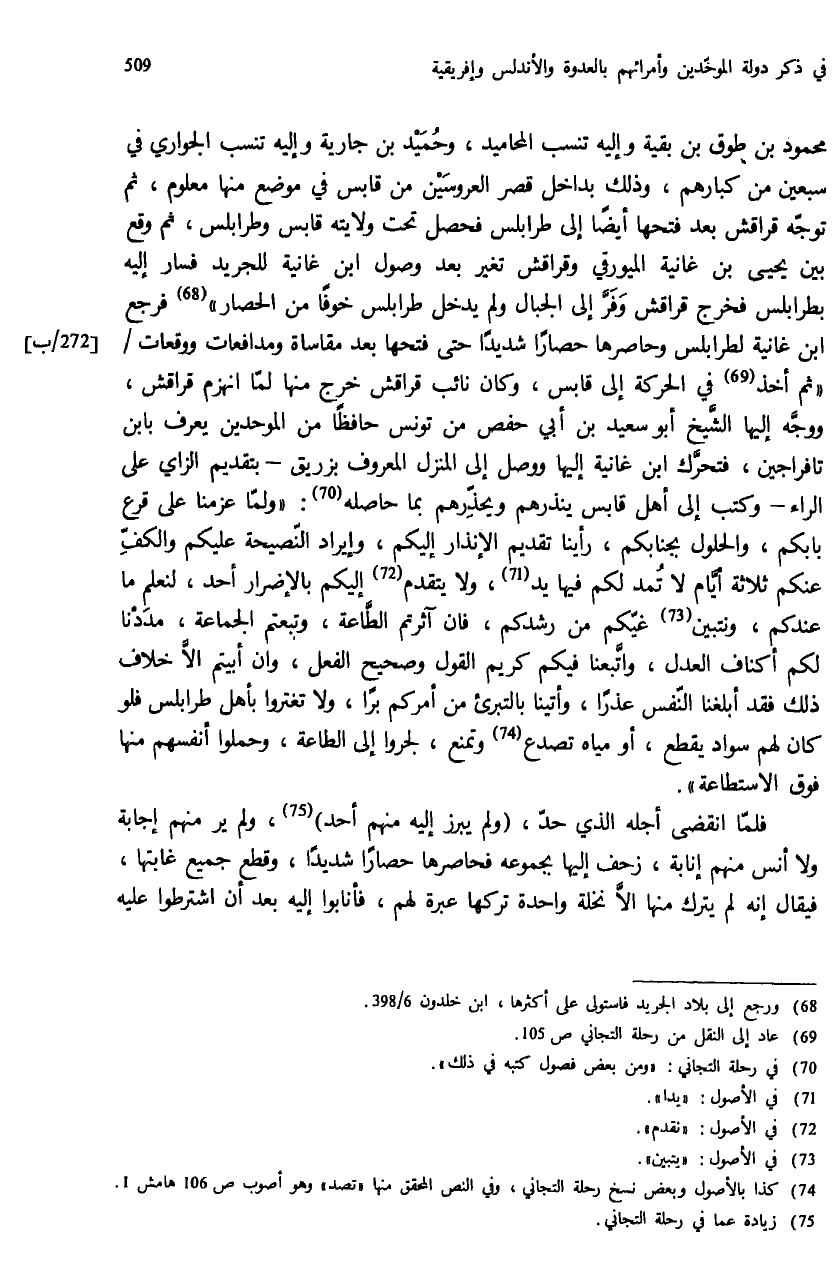 محمود بن طوق بن بقية وإليه تنسب المحاميد، وحميد بن جارية وإليه تنسب الجواري في سبعين من كبارهم، وذلك بداخل قصر العروسين من قابس في موضع منها معلوم، ثم توجّه قراقش بعد فتحها أيضا إلى طرابلس فحصل تحت ولايته قابس وطرابلس، ثم وقع بين يحيى بن غانية الميورقي وقراقش تغير بعد وصول ابن غانية للجريد فسار إليه بطرابلس فخرج قراقش وفرّ إلى الجبال ولم يدخل طرابلس خوفا من الحصار» (¬68) فرجع ابن غانية لطرابلس وحاصرها حصارا شديدا حتى فتحها بعد مقاساة ومدافعات ووقعات / «ثم أخذ (¬69) في الحركة إلى قابس، وكان نائب قراقش خرج منها لمّا انهزم قراقش، ووجّه إليها الشّيخ أبو سعيد بن أبي حفص من تونس حافظا من الموحدين يعرف بابن تافراجين، فتحرّك ابن غانية إليها ووصل إلى المنزل المعروف بزريق - بتقديم الزاي على الراء -، وكتب إلى أهل قابس ينذرهم ويحذّرهم بما حاصله (¬70): «ولمّا عزمنا على قرع بابكم، والحلول بجنابكم، رأينا تقديم الإنذار إليكم، وإيراد النّصيحة عليكم والكفّ عنكم ثلاثة أيّام لا تمدّ لكم فيها يد (¬71)، ولا يتقدم (¬72) إليكم بالإضرار أحد، لنعلم ما عندكم، ونتبين (¬73) غيّكم من رشدكم، فان آثرتم الطّاعة، وتبعتم الجماعة، مددنا لكم أكناف العدل، واتّبعنا فيكم كريم القول وصحيح الفعل، وان أبيتم الاّ خلاف ذلك فقد أبلغنا النّفس عذرا، وأتينا بالتبرئ من أمركم برا، ولا تغتروا بأهل طرابلس فلو كان لهم سواد يقطع، أو مياه تصدع (¬74)، أو مياه تصدع (74) وتمنع، لجروا إلى الطاعة، وحملوا أنفسهم منها فوق الاستطاعة».