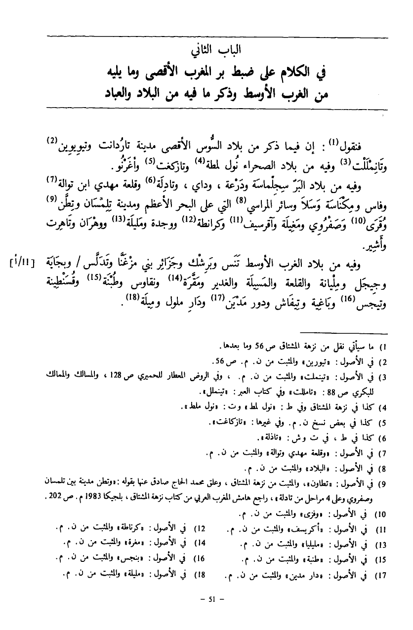 (¬9) في الأصول: «تطاون»، والمثبت من نزهة المشتاق، وعلق محمد الحاج صادق عنها بقوله: «وتطن مدينة بين تلمسان وصفروي وعلى 4 مراحل من تادلة»، راجع هامش المغرب العربي من كتاب نزهة المشتاق، بلجيكا 1983 م. ص: 202.
