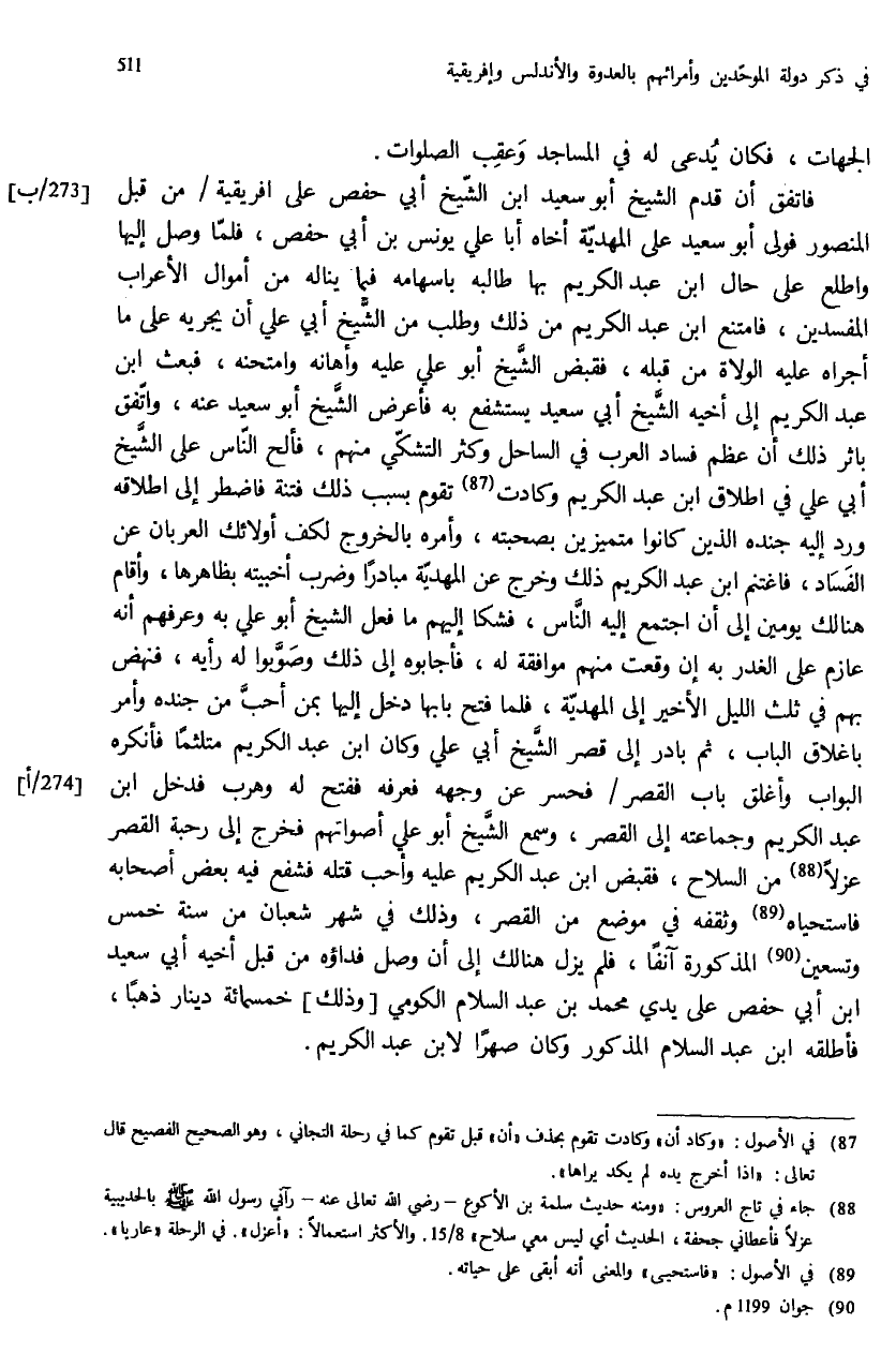 فاتفق أن قدم الشيخ أبو سعيد ابن الشّيخ أبي حفص على افريقية / من قبل المنصور فولى أبو سعيد على المهديّة أخاه أبا علي يونس بن أبي حفص، فلمّا وصل إليها واطلع على حال ابن عبد الكريم بها طالبه باسهامه فيما يناله من أموال الأعراب المفسدين، فامتنع ابن عبد الكريم من ذلك وطلب من الشّيخ أبي علي أن يجريه على ما أجراه عليه الولاة من قبله، فقبض الشّيخ أبو علي عليه وأهانه وامتحنه، فبعث ابن عبد الكريم إلى أخيه الشّيخ أبي سعيد يستشفع به فأعرض الشّيخ أبو سعيد عنه، واتّفق باثر ذلك أن عظم فساد العرب في الساحل وكثر التشكّي منهم، فألح النّاس على الشّيخ أبي علي في اطلاق ابن عبد الكريم وكادت (¬87) تقوم بسبب ذلك فتنة فاضطر إلى اطلاقه ورد إليه جنده الذين كانوا متميزين بصحبته، وأمره بالخروج لكف أولائك العربان عن الفساد، فاغتنم ابن عبد الكريم ذلك وخرج عن المهديّة مبادرا وضرب أخبيته بظاهرها، وأقام هنالك يومين إلى أن اجتمع إليه النّاس، فشكا إليهم ما فعل الشيخ أبو علي به وعرفهم أنه عازم على الغدر به إن وقعت منهم موافقة له، فأجابوه إلى ذلك وصوّبوا له رأيه، فنهض بهم في ثلث الليل الأخير إلى المهديّة، فلما فتح بابها دخل إليها بمن أحبّ من جنده وأمر باغلاق الباب، ثم بادر إلى قصر الشّيخ أبي علي وكان ابن عبد الكريم متلثما فأنكره البواب وأغلق باب القصر / فحسر عن وجهه فعرفه ففتح له وهرب فدخل ابن عبد الكريم وجماعته إلى القصر، وسمع الشّيخ أبو علي أصواتهم فخرج إلى رحبة القصر عزلا (¬88) من السلاح، فقبض ابن عبد الكريم عليه وأحب قتله فشفع فيه بعض أصحابه فاستحياه (¬89) وثقفه في موضع من القصر، وذلك في شهر شعبان من سنة خمس وتسعين (¬90) المذكورة آنفا، فلم يزل هنالك إلى أن وصل فداؤه من قبل أخيه أبي سعيد ابن أبي حفص على يدي محمد بن عبد السلام الكومي [وذلك] خمسمائة دينار ذهبا، فأطلقه ابن عبد السلام المذكور وكان صهرا لابن عبد الكريم.