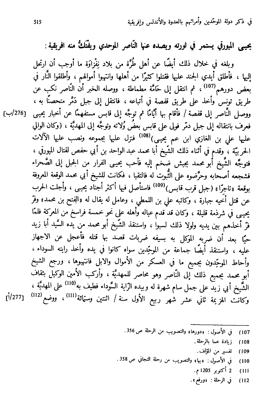 وبلغه في خلال ذلك أيضا عن أهل طرّة من بلاد نفزاوة ما أوجب أن ارتحل إليها، فأطلق أيدي الجند عليها فقتلوا كثيرا من أهلها وانتهبوا أموالهم، وأطلقوا النّار في بعض دورهم (¬107)، ثم انتقل إلى حامّة مطماطة، ووصله الخبر أن النّاصر نكب عن طريق تونس وأخذ على طريق قفصة في أتباعه، فانتقل إلى جبل دمّر متحصنا به، ووصل النّاصر إلى قفصة / فأقام بها أيّاما ثم توجّه إلى قابس مستفهما عن أخبار يحيى فعرف بانتقاله إلى جبل دمّر فولى على قابس بعض ولاته وتوجّه إلى المهديّة، (وكان الوالي عليها علي بن الغازي ابن عم يحيى) (¬108) فنزل عليها بجموعه ونصب عليها الآلات الحربيّة، وقدم في أثناء ذلك الشّيخ أبا محمد عبد الواحد بن أبي حفص لقتال الميورقي، فتوجّه الشّيخ أبو محمد بجيش ضخم إليه فأحب يحيى الفرار من الجبل إلى الصّحراء فشجعه أصحابه وحرّضوه على الثّبوت له فالتقيا، فكانت للشيخ أبي محمد الوقعة المعروفة بوقعة «تاجرا» (جبل قرب قابس) (¬109) فاستأصل فيها أكثر أجناد يحيى، وأجلت الحرب عن قتل أخيه جبارة، وكاتبه علي بن اللمطي، وعامل له يقال له «الفتح بن محمد» وفرّ يحيى في شرذمة قليلة، وكان قد قدم عياله وأهله على نحو خمسة فراسخ من المعركة فلمّا فرّ أخذهم بين يديه ولولا ذلك لسبوا، واستنقذ الشّيخ أبو محمد من يده السّيد أبا زيد حيا بعد أن ضربه الموكل به بسيفه ضربات قصد بها قتله فأعجل عن الاجهاز عليه، واستنقذ أيضا جماعة من الموحّدين سواه كانوا في يده وأخذ رايته السوداء، وأحاط الموحّدون بجميع ما في العسكر من الأموال والابل فانتهبوها، ورجع الشيخ أبو محمد بجميع ذلك إلى النّاصر وهو محاصر للمهديّة، وأركب الأمين الوكيل بثقاف الشّيخ أبي زيد على جمل سام شهرة له وبيده الرّاية السّوداء فطيف به (¬110) على المهديّة، وكانت الهزيمة ثاني عشر شهر ربيع الأول سنة / اثنتين وستمائة (¬111)، ووضع (¬112)