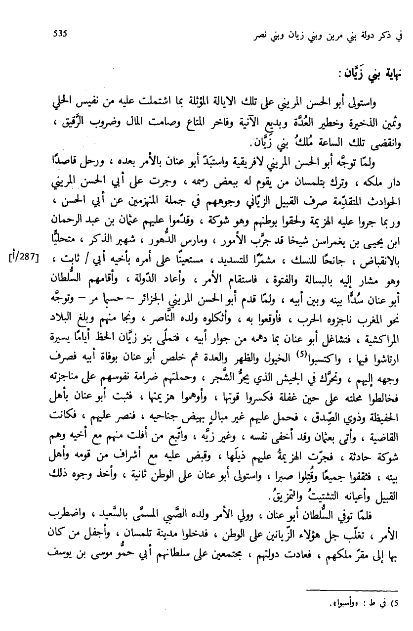ولمّا توجّه أبو الحسن المريني لافريقية واستبدّ أبو عنان بالأمر بعده، ورحل قاصدا دار ملكه، وترك بتلمسان من يقوم له ببعض رسمه، وجرت على أبي الحسن المريني الحوادث المتقدّمة صرف القبيل الزيّاني وجوههم في جملة المنهزمين عن أبي الحسن، وربما جروا عليه الهزيمة ولحقوا بوطنهم وهو شوكة، وقدّموا عليهم عثمان بن عبد الرحمان ابن يحيى بن يغمراسن شيخا قد جرّب الأمور، ومارس الدّهور، شهير الذكر، متحليّا بالانقباض، جانحا للنسك، مشمّرا للتسديد، مستعينا على أمره بأخيه أبي / ثابت، وهو مشار إليه بالبسالة والفتوة، فاستقام الأمر، وأعاد الدّولة، وأقامهم السّلطان أبو عنان سدّا بينه وبين أبيه، ولمّا قدم أبو الحسن المريني الجزائر - حسبما مر - وتوجّه نحو المغرب ناجزوه الحرب، فأوقعوا به، وأثكلوه ولده النّاصر، ونجا منهم وبلغ البلاد المراكشية، فتشاغل أبو عنان بما دهمه من جوار أبيه، فتملّى بنو زيّان الحظ أياما يسيرة ارتاشوا فيها، واكتسبوا (¬5) الخيول والظهر والعدة ثم خلص أبو عنان بوفاة أبيه فصرف وجهه إليهم، وتحرّك في الجيش الذي يجرّ الشّجر، وحملتهم ضرامة نفوسهم على مناجزته فخالطوا محلته على حين غفلة فكسروا قوتها، وأوهموا هزيمتها، فثبت أبو عنان بأهل الحفيظة وذوي الصّدق، فحمل عليهم غير مبال بهيض جناحيه، فنصر عليهم، فكانت القاضية، وأتى بعثمان وقد أخفى نفسه، وغير زيّه، واتّبع من أفلت منهم مع أخيه وهم شوكة حادثة، فجرّت الهزيمة عليهم ذيلها، وقبض عليه مع أشراف من قومه وأهل بيته، فثقفوا جميعا وقتلوا صبرا، واستولى أبو عنان على الوطن ثانية، وأخذ وجوه ذلك القبيل وأعيانه التشتيت والتمزيق.