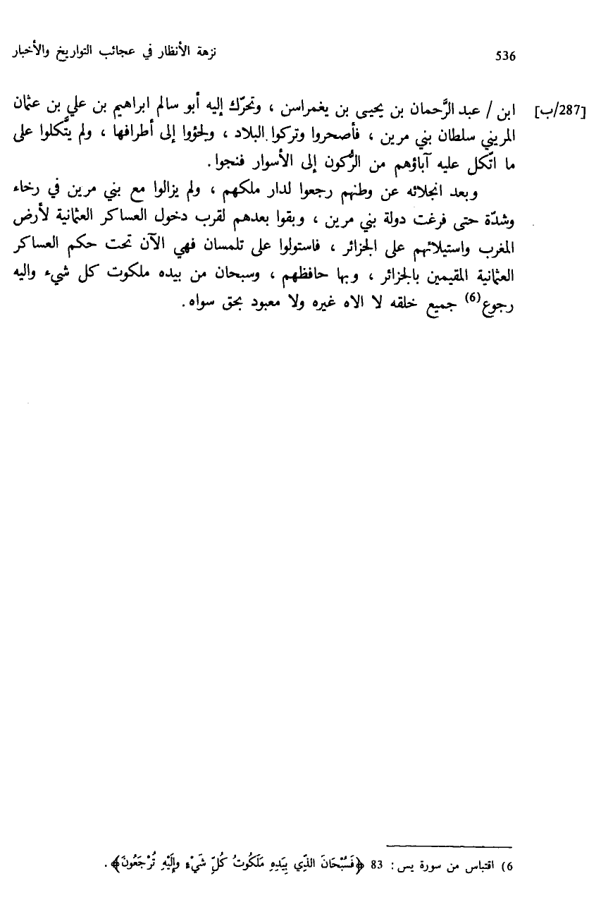وبعد انجلائه عن وطنهم رجعوا لدار ملكهم، ولم يزالوا مع بني مرين في رخاء وشدّة حتى فرغت دولة بني مرين، وبقوا بعدهم لقرب دخول العساكر العثمانية لأرض المغرب واستيلائهم على الجزائر، فاستولوا على تلمسان فهي الآن تحت حكم العساكر العثمانية المقيمين بالجزائر، وبها حافظهم، وسبحان من بيده ملكوت كل شيء واليه رجوع (¬6) جميع خلقه لا الاه غيره ولا معبود بحق سواه.