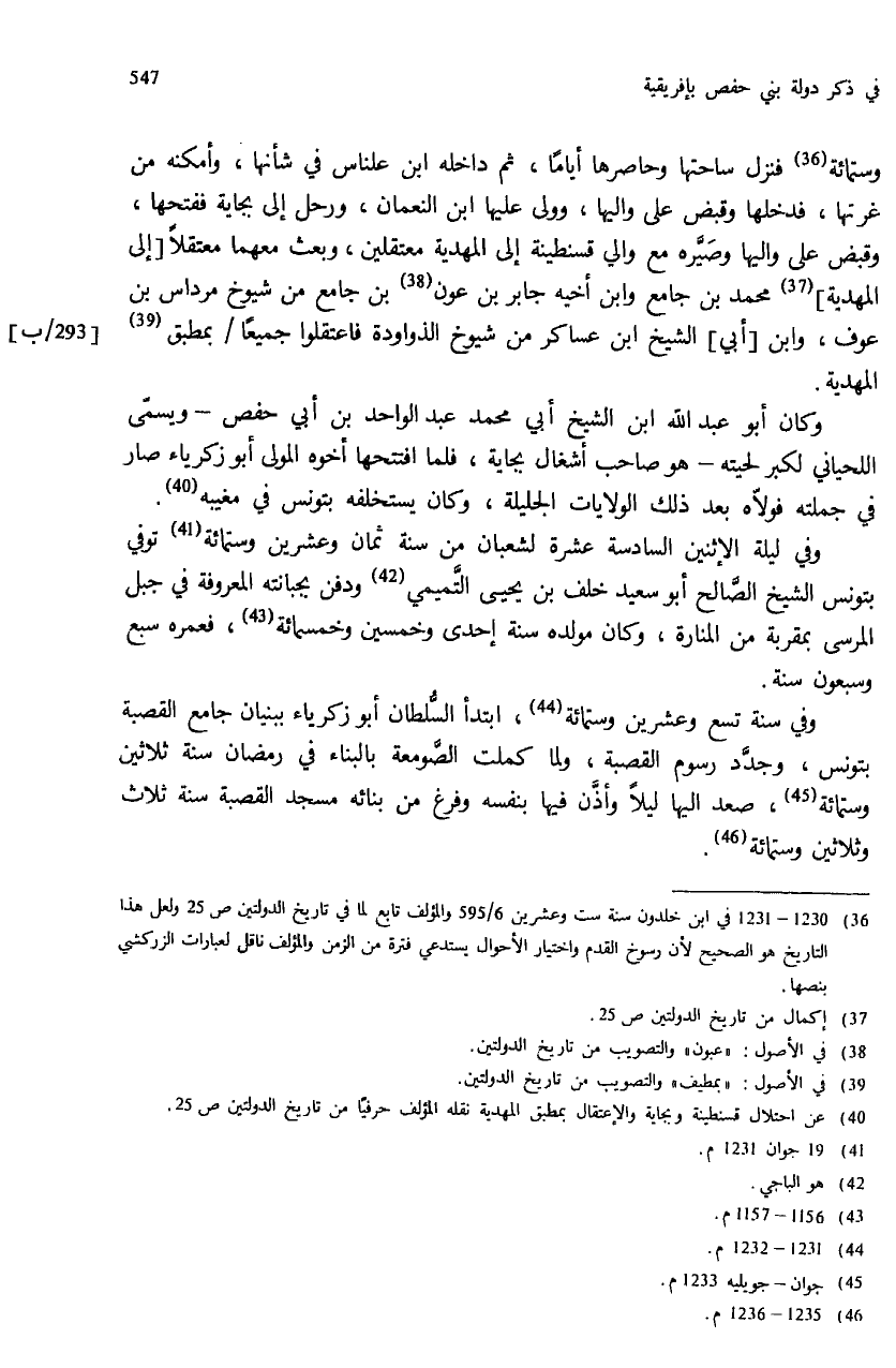 (¬36) 1230 - 1231 في ابن خلدون سنة ست وعشرين 6/ 595 والمؤلف تابع لما في تاريخ الدولتين ص: 25 ولعل هذا التاريخ هو الصحيح لأن رسوخ القدم واختيار الأحوال يستدعي فترة من الزمن والمؤلف ناقل لعبارات الزركشي بنصها.