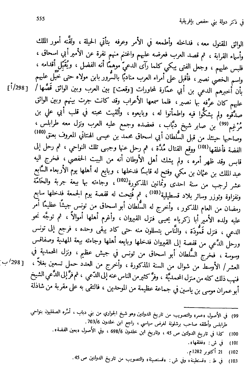 (¬99) في الأصول «عمر» والتصويب من تاريخ الدولتين وهو شيخ الجواري من بني دباب، أسّره الصقليون بنواحي طرابلس وأطلقه صاحب برشلونة لغرض سياسي، راجع ابن خلدون 6/ 703.