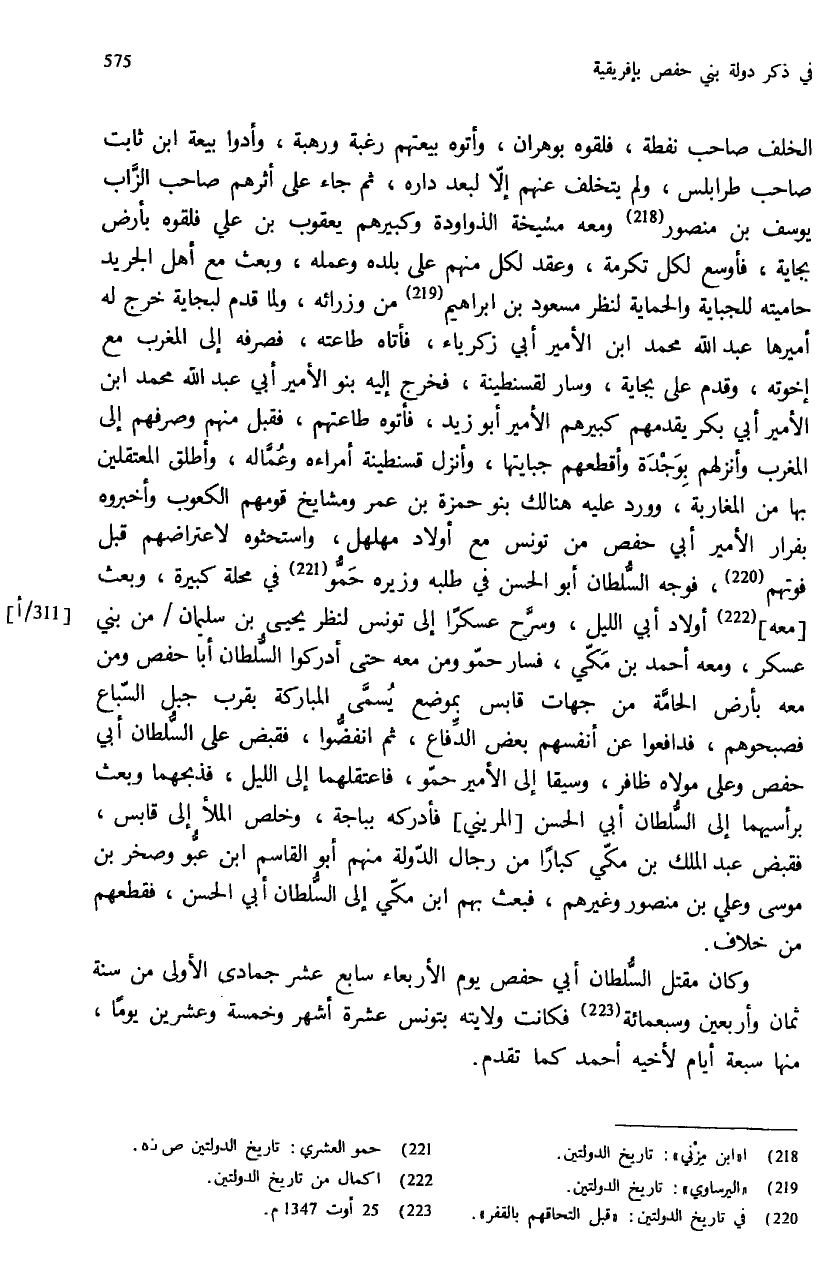 وكان مقتل السّلطان أبي حفص يوم الأربعاء سابع عشر جمادى الأولى من سنة ثمان وأربعين وسبعمائة (¬223) فكانت ولايته بتونس عشرة أشهر وخمسة وعشرين يوما، منها سبعة أيام لأخيه أحمد كما تقدم.