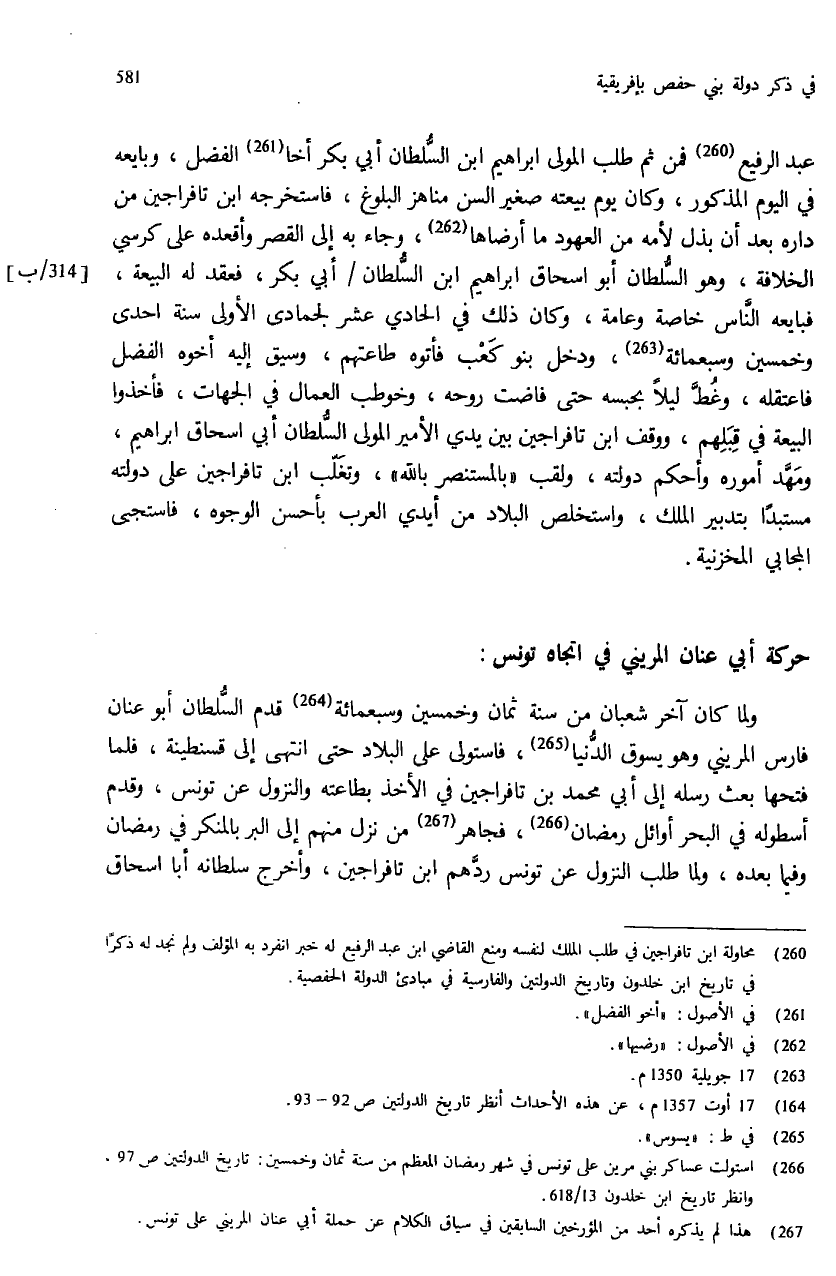 (¬260) محاولة ابن تافراجين في طلب الملك لنفسه ومنع القاضي ابن عبد الرفيع له خبر انفرد به المؤلف ولم نجد له ذكرا في تاريخ ابن خلدون وتاريخ الدولتين والفارسية في مبادئ الدولة الحفصية.