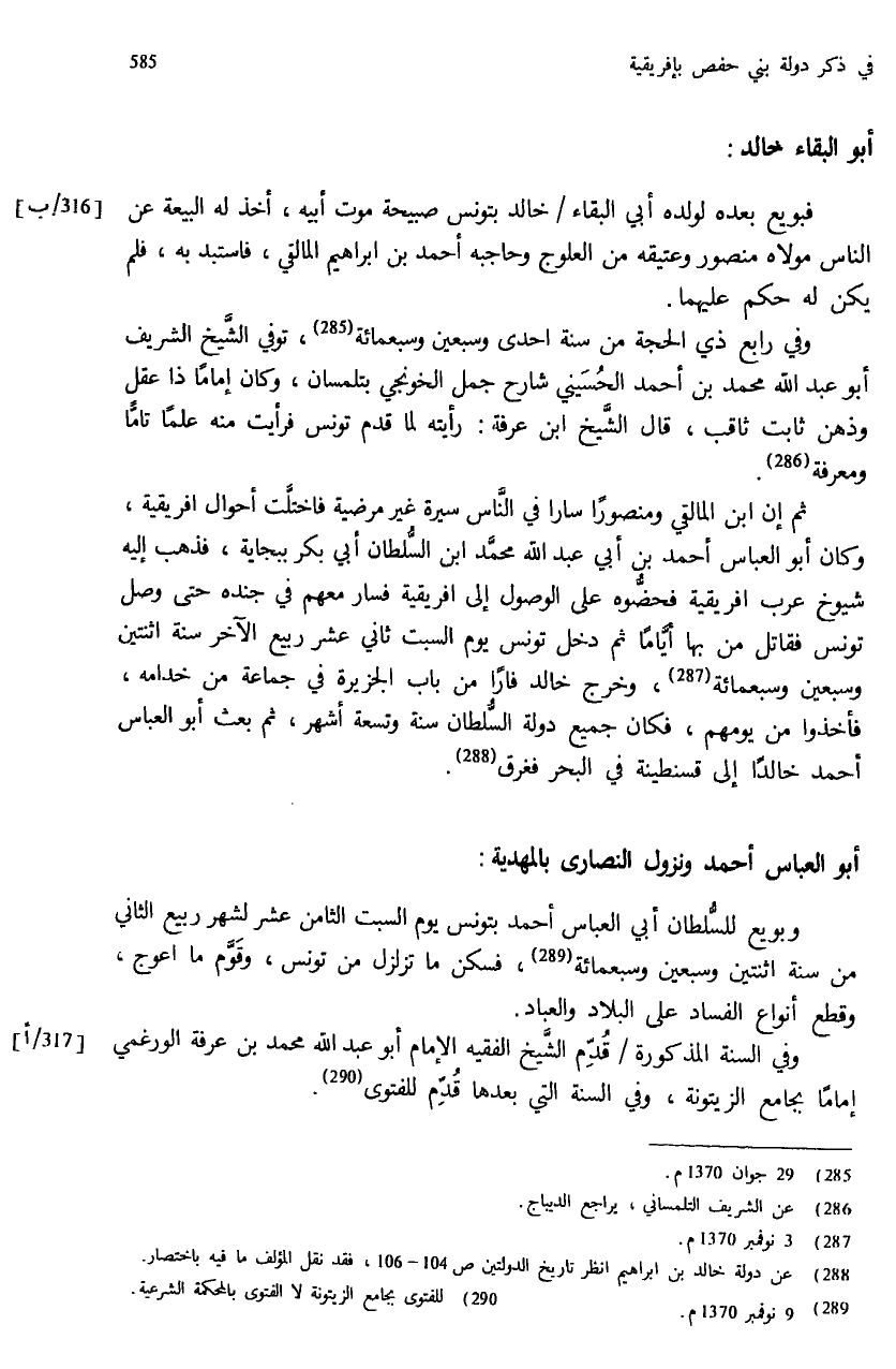 ثم إن ابن المالقي ومنصورا سارا في النّاس سيرة غير مرضية فاختلّت أحوال افريقية، وكان أبو العباس أحمد بن أبي عبد الله محمّد ابن السّلطان أبي بكر ببجاية، فذهب إليه شيوخ عرب افريقية فحضّوه على الوصول إلى افريقية فسار معهم في جنده حتى وصل تونس فقاتل من بها أيّاما ثم دخل تونس يوم السبت ثاني عشر ربيع الآخر سنة اثنتين وسبعين وسبعمائة (¬287)، وخرج خالد فارا من باب الجزيرة في جماعة من خدامه، فأخذوا من يومهم، فكان جميع دولة السّلطان سنة وتسعة أشهر، ثم بعث أبو العباس أحمد خالدا إلى قسنطينة في البحر فغرق (¬288).