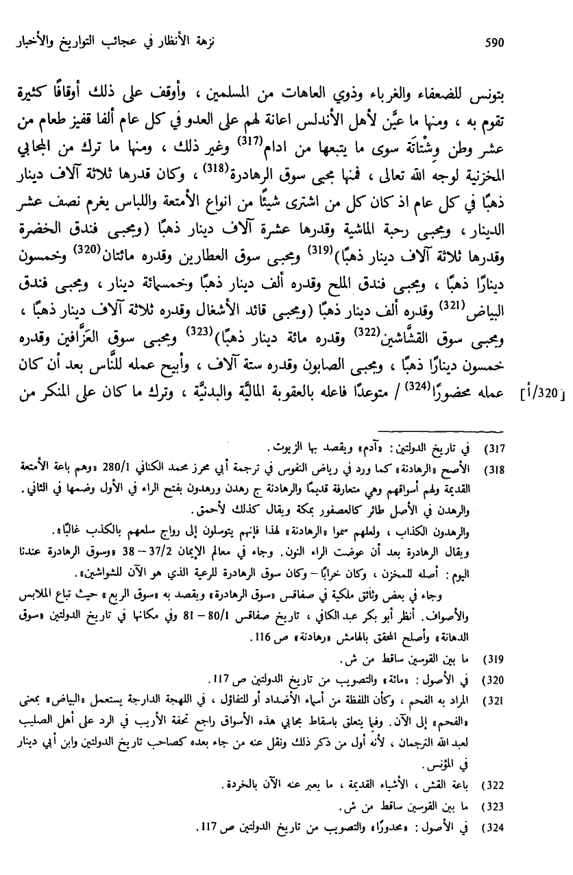 (¬321) المراد به الفحم، وكأن اللفظة من أسماء الأضداد أو للتفاؤل، في اللهجة الدارجة يستعمل «البياض» بمعنى «الفحم» إلى الآن. وفيما يتعلق باسقاط مجابي هذه الأسواق راجع تحفة الأريب في الرد على أهل الصليب لعبد الله الترجمان، لأنه أول من ذكر ذلك ونقل عنه من جاء بعده كصاحب تاريخ الدولتين وابن أبي دينار في المؤنس.