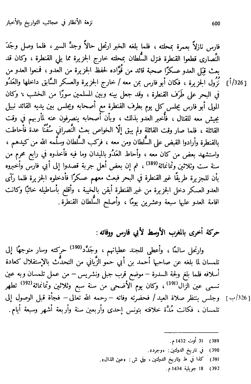 فارس نازلا بعمرة بمحلته، فلما بلغه الخبر ارتحل حالا وجدّ السير، فلما وصل وجد النّصارى قطعوا القنطرة فنزل السّلطان بمحلته خارج الجزيرة مما يلي القنطرة، وكان قد بعث قبل العدو عسكرا صحبة قائد من قوّاده لحفظ الجزيرة من العدو، فمنعوا العدو من نزول الجزيرة، فكان أبو فارس بمن معه / خارج الجزيرة والعسكر السّابق داخلها والعدو في البحر على طرف القنطرة، وقد جعل بينه وبين المسلمين سورا من الخشب، وكان المولى أبو فارس يجلس كل يوم بطرف القنطرة مع أصحابه ويجلس بين يديه القائد نبيل بجيش معه للقتال، فأخبر العدو بذلك، وبأن أصحابه ينصرفون عنه لمأربهم في وقت القائلة، فلما صار وقت القائلة ولم يبق إلاّ الخواص بعث النّصراني سفنا عدة فأحاطت بالقنطرة وأرادوا القبض على السّلطان ومن معه، فركب السّلطان وسلّمه الله من كيدهم، واستشهد بعض من كان معه، وأحاط العدو بالميدان وما فيه فأخذوه في رابع محرم من سنة ست وثلاثين وثمانمائة (¬389)، ثم إن بعض أهل جربة قصدوا إلى أبي فارس وأخبروه بأن للجزيرة طريقا غير القنطرة في البحر فبعث معهم عسكرا فأدخلوه الجزيرة فلما رآى العدو العسكر دخل الجزيرة من غير القنطرة أيقن بالخيبة، وأقلع بأساطيله خائبا وكانت اقامة العدو عليها سبعة وعشرين يوما، وأصلح السّلطان القنطرة.