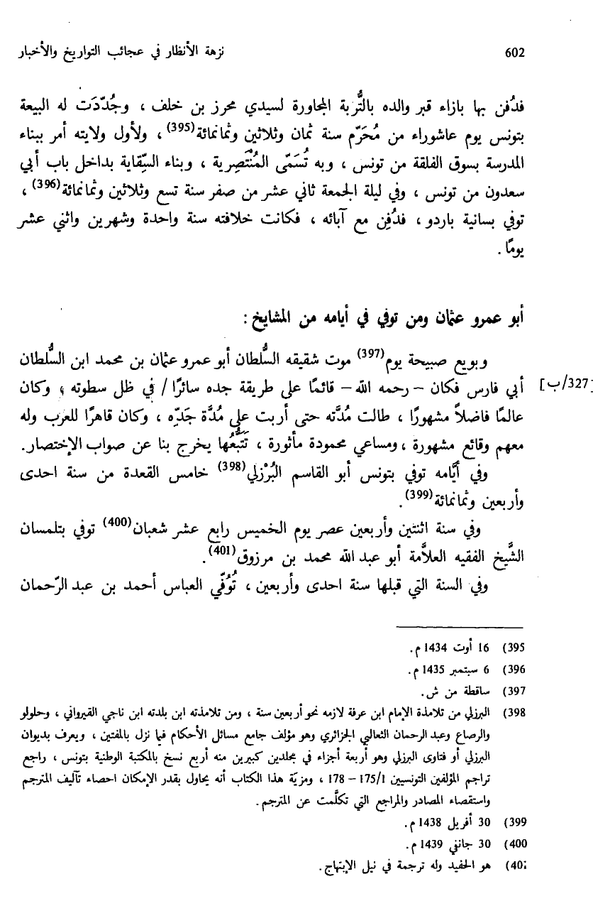 وفي أيّامه توفي بتونس أبو القاسم البرزلي (¬398) خامس القعدة من سنة احدى وأربعين وثمانمائة (¬399).