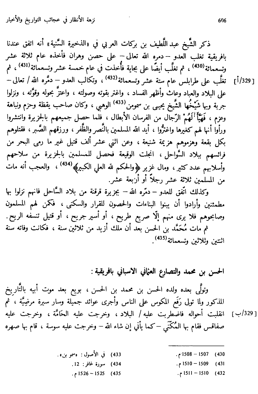 ذكر الشّيخ عبد اللّطيف بن بركات العربي في «الذخيرة السّنية» أنه اتفق عندنا بافريقية تغلب العدو - دمره الله تعالى - على حصن وهران فأخذه عام ثلاثة عشر وتسعمائة (¬430)، ثم تغلّب أيضا على بجاية فأخذت في عام خمسة عشر وتسعمائة (¬431)، ثم تغلّب على طرابلس عام ستة عشر وتسعمائة (¬432)، وتكالب العدو - دمّره الله / تعالى - على البلاد والعباد وعاث وأظهر الفساد، واغتر بقوته وصولته، واعتزّ بحوله وقوّته، ونزلوا جربة وبها شيخها الشّيخ يحيى بن سمومن (¬433) الوهبي، وكان صاحب يقظة وحزم ونباهة وعزم، فهيّأ لهم الرّجال من الفرسان الأبطال، فلما حصل جميعهم بالجزيرة وانتشروا ورأوا أنها لهم كغيرها واغترّوا، أيد الله المسلمين بالنّصر والظّفر، ورزقهم الصّبر، فقتلوهم بكل بقعة وهزموهم هزيمة شنيعة، وعن اثني عشر ألف قتيل غير ما رمى البحر من فرائسهم ببلاد السّواحل، انجلت الوقيعة فحصل للمسلمين بالجزيرة من سلاحهم وأسلابهم عدد كثير، ومال غزير {فَالْحُكْمُ لِلّهِ الْعَلِيِّ الْكَبِيرِ} (¬434)، والعجب أنه مات من المسلمين ثلاثة عشر رجلا أو أربعة عشر.