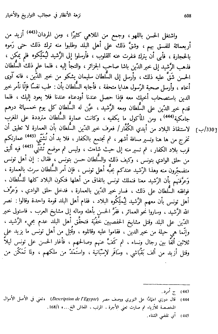 واشتغل الحسن باللهو، وجمع من الملاهي كثيرا، ومن المردان (¬443) أزيد من أربعمائة للفسق بهم، وشقّ ذلك على أهل البلد وطلبوا منه ترك ذلك حتى رموه بالحجارة، فأبى أن يترك فنفرت عنه القلوب، فأرسلوا إلى الرّشيد ليملّكوه فلم يمكن، فذهب الرّشيد إلى خير الدّين باشا صاحب الجزائر، والتجأ إليه، فلما علم ذلك السّلطان الحسن شقّ عليه ذلك، وأرسل إلى السّلطان سليمان يشكو من خير الدّين، فانه آوى أخاه، وأرسل صحبة الرّسول هدايا متحفة، فأجابه السّلطان بأن: طب نفسا فإنّا نأمر خير الدين باستصحاب أخيك معه فإذا حصل عندنا أودعناه عندنا فلا يعود إليك، فلما قدم خير الدّين على السّلطان ومعه الرّشيد، عيّن له السّلطان كل يوم خمسمائة درهم جامكية (¬444)، ومن المأكول ما يكفيه، وكانت عمارة السّلطان مترددة على المغرب لاستنقاذ البلاد من أيدي الكفّار / فعرف خير الدّين السّلطان بأن العمارة لا تطيق أن تخرج من هاهنا وتسير مسافة أشهر، ثم تجتمع بالكفار، فلا بد أن تشتّي (445) عمارتكم قرب بلاد الكفار، ثم تسير منه إلى حيث شاءت، وليس ثم موضع تشتّي (¬445) فيه أليق من حلق الوادي بتونس، وكيف ذلك والسّلطان حسن بتونس، فقال: إن أهل تونس متضجّرون منه وهذا الرّشيد عندكم يحبّه أهل تونس، فإن أمر السّلطان سرت بالعمارة، وعرّفتهم بأن الرّشيد معنا فنملك تونس باتفاق من أهلها فتكون البلاد كلها للسّلطان، فوافقه السّلطان على ذلك، فسار خير الدّين بالعمارة، فدخل حلق الوادي، وعرّف أهل تونس بأن معهم الرّشيد ليملّكوه البلاد، فقام أهل البلد قومة واحدة وقالوا: نصر الله الرّشيد، وساروا نحو العمائر، ففرّ الحسن بأهله وماله إلى مشايخ العرب، فاستولى خير الدّين على البلد وقتل مشايخ الحفصيين خفية فتحقّق أهل البلد عدم مجيء الرّشيد، وإنّما هي حيلة من خير الدين، فقاموا عليه وقاتلوه، وقتل من أهل تونس ما يزيد على ثلاثين ألفا بين رجال ونساء، ثم كفّ عنهم وصالحهم، فأغار الحسن على تونس ليلا وقتل أزيد من ألف بقباشي، وسافر لإسبانية، واستمدّ من ملكهم، ولما تمكّن من