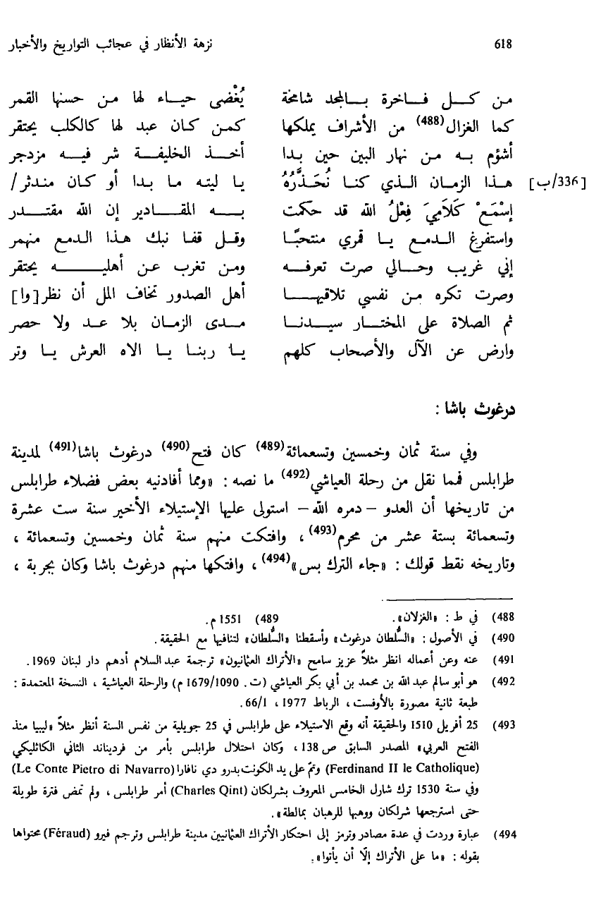 (¬493) 25 أفريل 1510 والحقيقة أنه وقع الاستيلاء على طرابلس في 25 جويلية من نفس السنة أنظر مثلا «ليبيا منذ الفتح العربي» المصدر السابق ص: 138، وكان احتلال طرابلس بأمر من فرديناند الثاني الكاثليكي (Ferdinand II le Catholique) وتمّ على يد الكونت بدرودي نافارا (Le Conte Pietro di Navarro) وفي سنة 1530 ترك شارل الخامس المعروف بشرلكان (Charles Qint) أمر طرابلس، ولم تمض فترة طويلة حتى استرجعها شرلكان ووهبها للرهبان بمالطة».