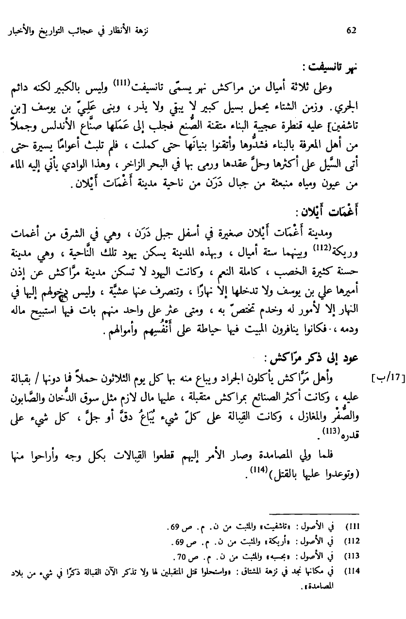 (¬114) في مكانها نجد في نزهة المشتاق: «واستحلوا قتل المتقبلين لها ولا تذكر الآن القبالة ذكرا في شيء من بلاد المصامدة».