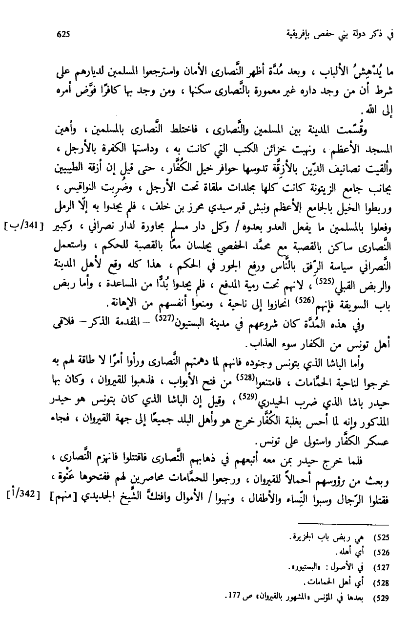 وقسّمت المدينة بين المسلمين والنّصارى، فاختلط النّصارى بالمسلمين، وأهين المسجد الأعظم، ونهبت خزائن الكتب التي كانت به، وداستها الكفرة بالأرجل، وألقيت تصانيف الدّين بالأزقّة تدوسها حوافر خيل الكفّار، حتى قيل إن أزقة الطيبيين بجانب جامع الزيتونة كانت كلها مجلدات ملقاة تحت الأرجل، وضربت النواقيس، وربطوا الخيل بالجامع الأعظم ونبش قبر سيدي محرز بن خلف، فلم يجدوا به إلاّ الرمل وفعلوا بالمسلمين ما يفعل العدو بعدوه / وكل دار مسلم مجاورة لدار نصراني، وكبير النّصارى ساكن بالقصبة مع محمّد الحفصي يجلسان معا بالقصبة للحكم، واستعمل النّصراني سياسة الرّفق بالنّاس ورفع الجور في الحكم، هذا كله وقع لأهل المدينة والربض القبلي (¬525)، لانهم تحت رمية المدفع، فلم يجدوا بدّا من المساعدة، وأما ربض باب السويقة فإنهم (¬526) انحازوا إلى ناحية، ومنعوا أنفسهم من الإهانة.
