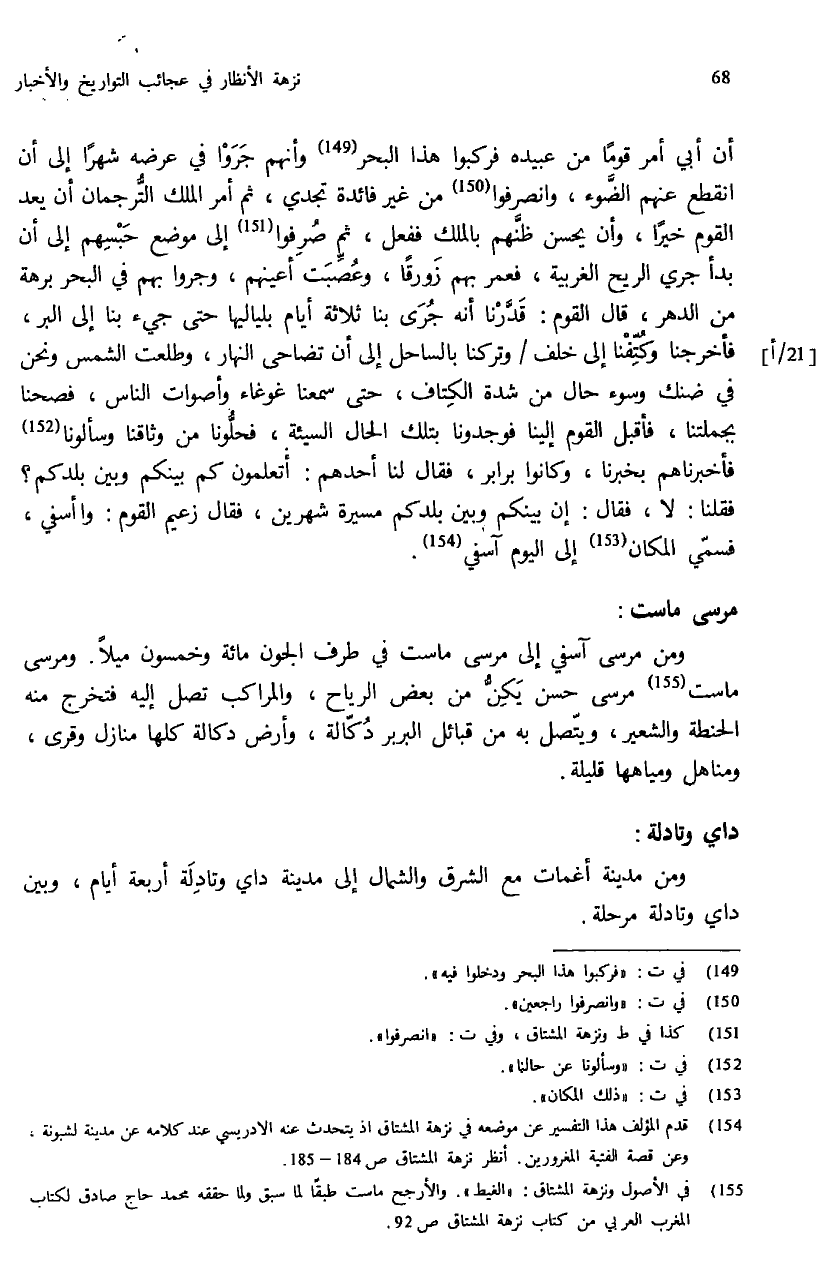 (¬154) قدم المؤلف هذا التفسير عن موضعه في نزهة المشتاق اذ يتحدث عنه الادريسي عند كلامه عن مدينة لشبونة، وعن قصة الفتية المغرورين. أنظر نزهة المشتاق ص: 184 - 185.