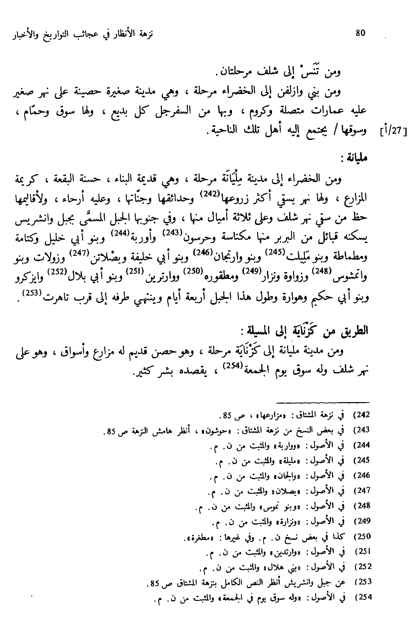 (¬242) في نزهة المشتاق: «مزارعها»، ص: 85.