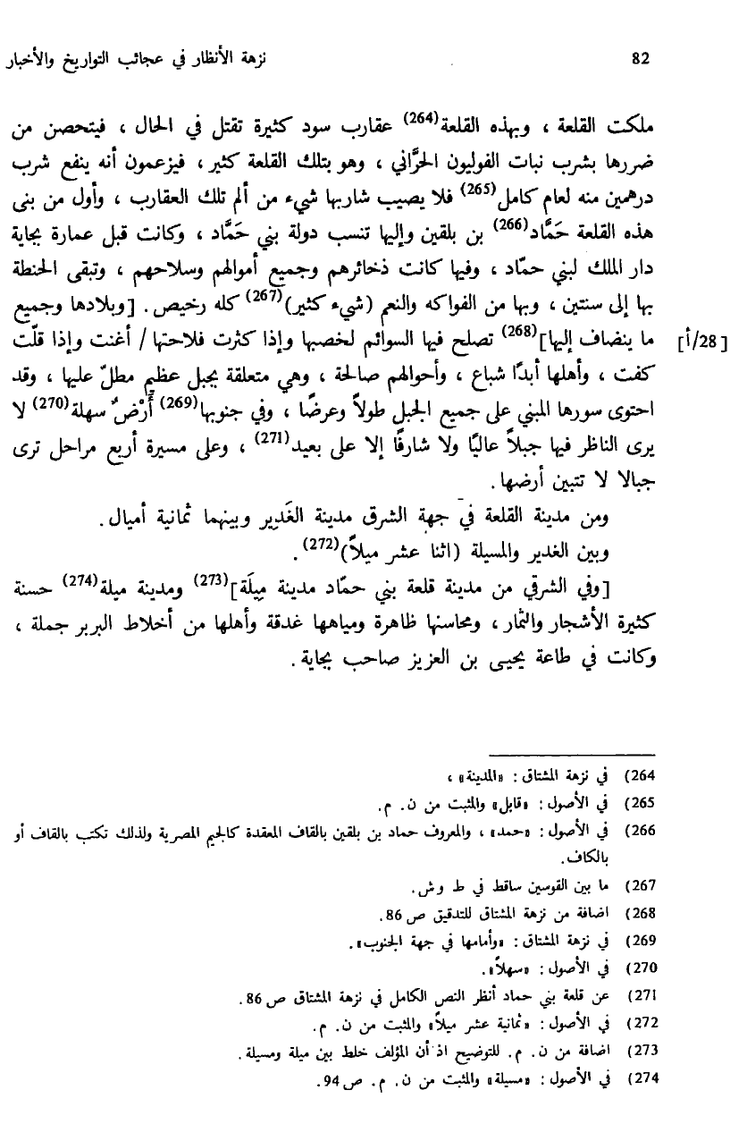 (¬271) عن قلعة بني حماد أنظر النص الكامل في نزهة المشتاق ص: 86.