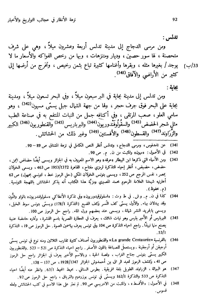 (¬346) بالفرنسية «La grande Centauree» والقنطوريون أصناف كثيرة تقارب الثلاثين ومنه نوع في تونس يسمّى أرجيقن أو أرجقينة. ويستعمل للصباغة باللون الأصفر. راجع احياء التذكرة ص: 521 - 523. والقنطوريون الكبير يسمّى بتونس جناح الغراب، وقصة الحية، وبالاسم الأخير يعرف في الجزائر راجع حل الرموز ص: 41، وكشف الرموز لعبد الراق بن أحمدوش الجزائر 1347/ 1928، ص: 137 - 138.