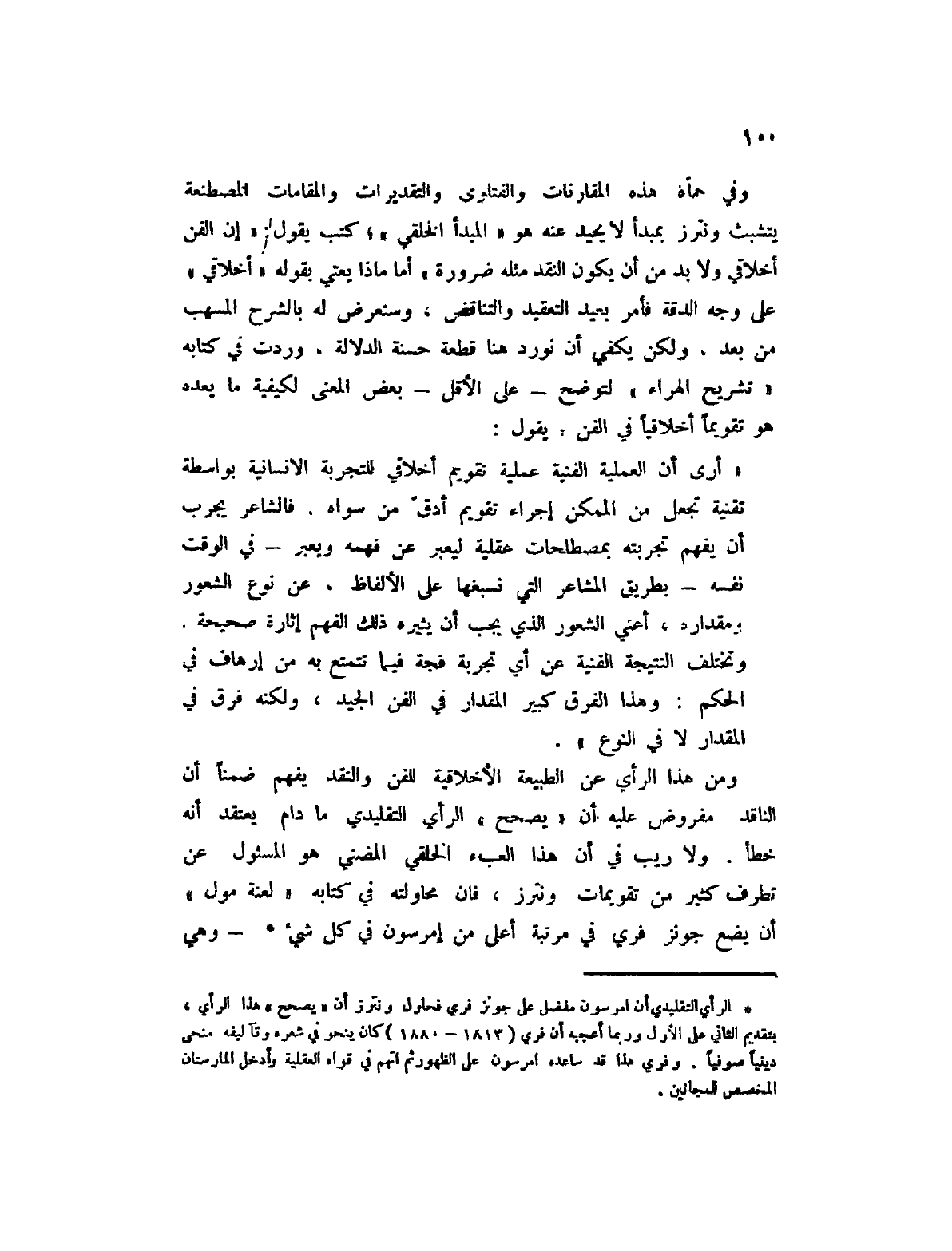 ومن هذا الرأي عن الطبيعة الأخلاقية للفن والنقد يفهم ضمنا أن الناقد مفروض عليه أن " يصحح " الرأي التقليدي ما دام يعتقد أنه خطأ. ولا ريب في أن هذا العبء الخلقي المضني هو المسئول عن تطرف كثير من تقويمات ونترز، فإن محاولته في كتابه " لعنة مول " أن يضع جونز فري في مرتبة أعلى من إمرسون في كل شيء (1) ؟ وهي