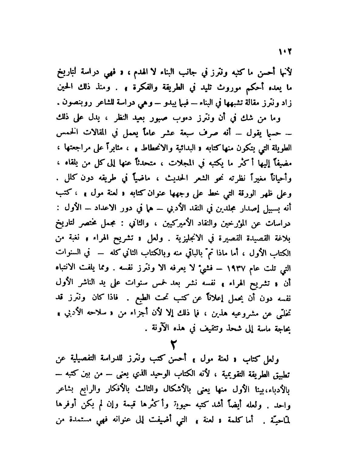- ولعل كتاب " لعنة مول " أحسن كتب ونترز للدراسة التفصيلية عن تطبيق الطريقة التقويمية، لأنه الكتاب الوحيد الذي يعنى؟ من بين كتبه؟ بالأدباء، بينا الأول منها يعنى بالأشكال والثالث بالأفكار والرابع بشاعر واحد. ولعلها أيضاً أشد كتبه حيوية وأكثرها قيمة وإن لم يكن أوفرها لماحية. أما كلمة " لعنة " التي أضيفت إلى عنوانه فهي مستمدة من