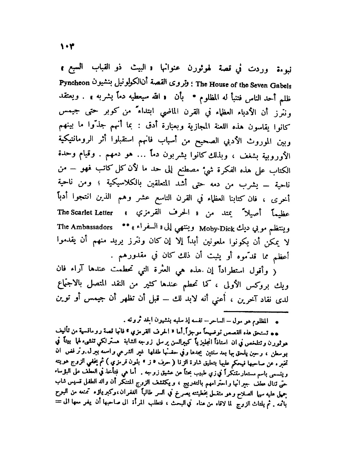 (2) تستحق هذه القصة توضيحاً موجزاً. أما الحرف القرمزي " فإنها قصة رومانسية من تأليف هوثورن وتتلخص في أن أستاذاً إنجليزياً كبير السن يرسل زوجه الشابة مستر لكي تنشئ لهما ليتاً في بوسطن، وحين يلحق بها بعد سنتين يجدها وفي حضنها طفلها غير الشرعي واسمه بيرل. وترفض أن تخبره عن صاحبها فيحكم عليها بتعليق شارة الزنا (حرف " ز " بلون قرمزي) ثم يخفي الزج هويته ويتسمى باسم مستعار متنكراً في زي طبيب بحثاً عن عشيق زوجه. أما هي فتأخذ في العطف على البؤساء حتى تنال عطف جيرانها واحترامهم بالتدريج، ويكتشف الزوج المتنكر أن والد الطفل قسيس شاب جميل عليه سيما الصلاح وهو مثقل بخطيئته يصرخ في السر طالباً الغفران، وكبرياؤه تمنعه من البوح بإثمه. ثم يلتاث الزوج لما لاقاه من عناء في البحث، فتطلب المرأة إلى صاحبها أن يفر معها إلى أوروبة فيرفض ويعترف على الملأ بما فعله ثم يموت بين يديها وقد حطمه شعوره بالخطيئة، أما هي فتعيش لابنها ولعمل الخير.