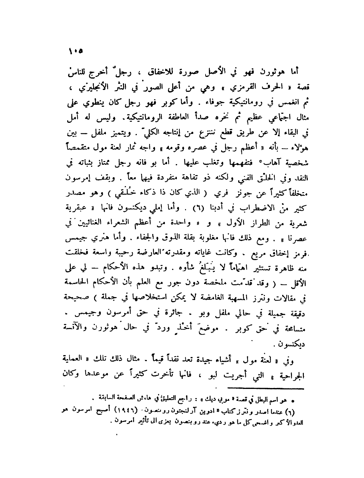 أما هوثورن فهو في الأصل صورة للإخفاق، رجل أخرج للناس قصة " الحرف القرمزي " وهي من أعلى الصور في النثر الإنجليزي، ثم انغمس في رومانتيكية جوفاء. وأما كوبر فهو رجل كان ينطوي على مثال اجتماعي عظيم ثم نخره صدأ العاطفة الرومانتيكية، وليس له أمل في البقاء إلا عن طريق قطع تنتزع من إنتاجه الكلي. ويتميز ملفل؟ بين هؤلاء؟ بأنه " أعظم رجل في عصره وقومه " واجه ثمار لعنة مول متقمصاً شخصية آهاب (1) فتفهمها وتغلب عليها. أما بو فإنه رجل ممتاز بثباته في النقد وفي الخلق الفني ولكنه ذو تفاهة متفردة فيهما معاً. ويقف إمرسون متخلفاً كثيراً عن جونز فري (الذي كان ذا ذكاء خلقي) وهو مصدر كثير من الاضطراب في أدبنا (2) . وأما إملي ديكنسون فإنها " عبقرية شعريه من الطراز الأول " و " واحدة من أعظم الشعراء الغنائيين في عصرنا ". ومع ذلك فإنها مغلوبة بقلة الذوق والجفاء. وأما هنري جيمس فرمز إخفاق مريع، وكانت غاياته ومقدرته العارضة رحيبة واسعة فخلقت منه ظاهرة تستثير اهتماماً لا يبلغ شأوه. وتبدو هذه الأحكام؟ لي على الأقل؟ (وقد قدمت ملخصة دون جور مع العلم بأن الأحكام الحاسمة في مقالات ونترز المسهبة الغامضة لا يمكن استخلاصها في جملة) صحيحة دقيقة جميلة في حالي ملفل وبو، جائزة في حق أمرسون وجيمس، متسامحة في حق كوبر، موضع أخذٍ ورد في حال هوثورن والآنسة ديكنسون.