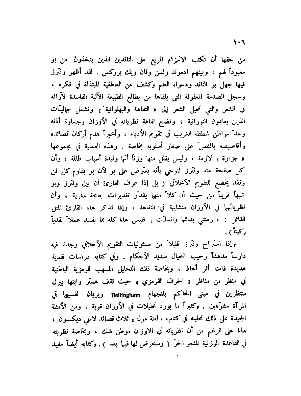من حقها أن نكتب الانهزام المريع على الناقدين الذين يتخذون من بو معبوداً لهم، وبينهم أدموند ولسن وفان ويك بروكس. لقد أظهر ونترز فيها جهل بو الناقد ودعواه العلم وكشف عن العاطفية المبتذلة في فكره، وسجل الصدمة المعقولة التي يلقاها من يطالع الطبيعة الآلية الفاسدة لآرائه في الشعر والتي تحيل الشعر إلى " التفاهة والبهلوانية " وتشمل جماليات الذين يعادون النورانية؛ وفضخ تفاهة نظرياته في الأوزان وجساوة أذنه وعد مواطن شططه الغريب في تقويم الأدباء، وأخيراً هدم أركان قصائده وأقاصيصه بالنص على صغار أسلوبه بخاصة. وهذه العملية في مجموعها " جزارة " لازمة، وليس يقلل منها وزناً أنها وليدة أسباب ظالمة، وأن كل صفحة عند ونترز لتوحي بأنه يعترض على بو لأن بو يقاوم كل فن ونقد يخضع للتقويم الأخلاقي (بل إذا عرف القارئ أن بين ونترز وبو شبهاً قريباً من حيث أن كلاً منهما يقدر تقديرات جامحة مغربة، وأن نظرياتهما في الأوزان متشابهة في التفاهة، وإذا تذكر هذا القارئ المثل القائل: " رمتني بدائها وانسلت " فليس هذا كله مما يفسد عملاً نقدياً ركيناً) .