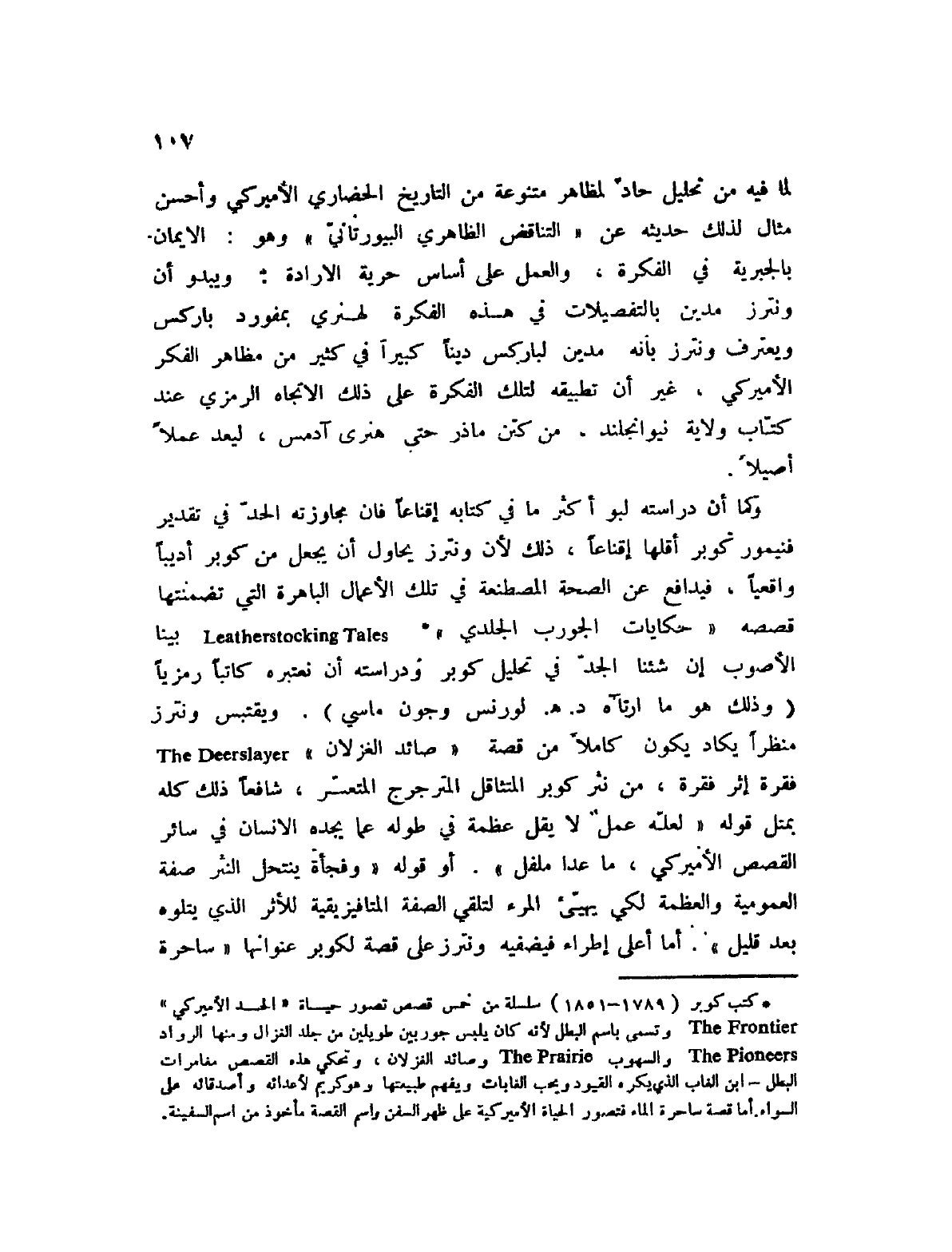 وكما أن دراسته لبو أكثر ما في كتابه إقناعاً فإن مجاوزته الحد في تقدير فنيمور كوبر أقلها إقناعاً، ذلك لأن ونترز يحاول أن يجعل من كوبر أديباً واقعياً، فيدافع عن الصحة المصطنعة في تلك الأعمال الباهرة التي تضمنتها قصصه " حكايات الجورب الجلدي " (1) Leatherstocking Tales بينا الأصوب إن شئنا الجد في تحليل كوبر ودراسته أن نعتبره كاتباً رمزياً (ذلك هو ما ارتآه د. هـ؟. لورنس وجون ماسي) . ويقتبس ونترز منظراً يكاد يكون كاملاً من قصة " صائد الغزلان " The Deerslayer فقرة إثر فقرة، من نثر كوبر المتثاقل المترجرج المتعسر، شافعاً ذلك كله بمثل قوله " لعله عمل لا يقل عظمة في طوله عما يجده الإنسان في سائر القصص الأميركي، ما عدا ملفل ". أو قوله " وفجأة ينتحل النثر صفة العمومية والعظمة لكي يهيئ المرء لتلقي الصفة المتافيزيقية للأثر الذي يتلوه بعد قليل ". أما أعلى إطراء فيضيفه ونترز على قصة لكوبر عنوانها " ساحرة