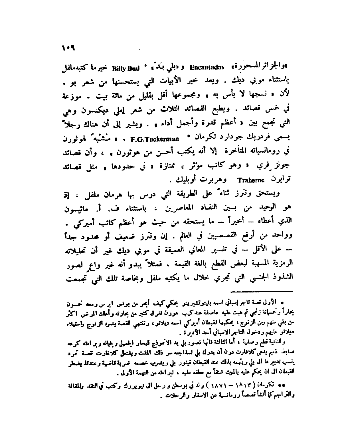 " والجزائر المسحورة " Encantadas و " بلي بد " (1) Billy Bud حير ما كتبه ملفل باستثناء موبي ديك. ويعد خير الأبيات التي يستحسنها من شعر بو، لأن " مسجها لا بأس به " ومجموعها أقل بقليل من مائة بيت، موزعة في خمس قصائد. ويطبع القصائد الثلاث من شعر إملي ديكنسون وهي التي تجمع بين " أعظم قدرة وأجمل أداء ". ويشير إلى أن هناك رجلاً يسمى فردريك جودارد تكرمان (2) F. G. Tuckerman، " مشبه لهوثورن في رومانسيته المتأخرة إلا أنه يكتب أحسن من هوثورن "، ون قصائد جونز فري " وهو كاتب مؤثر " ممتازة " في حدودها " مثل قصائد ترايرن Traberne وهربرت أوبليك.