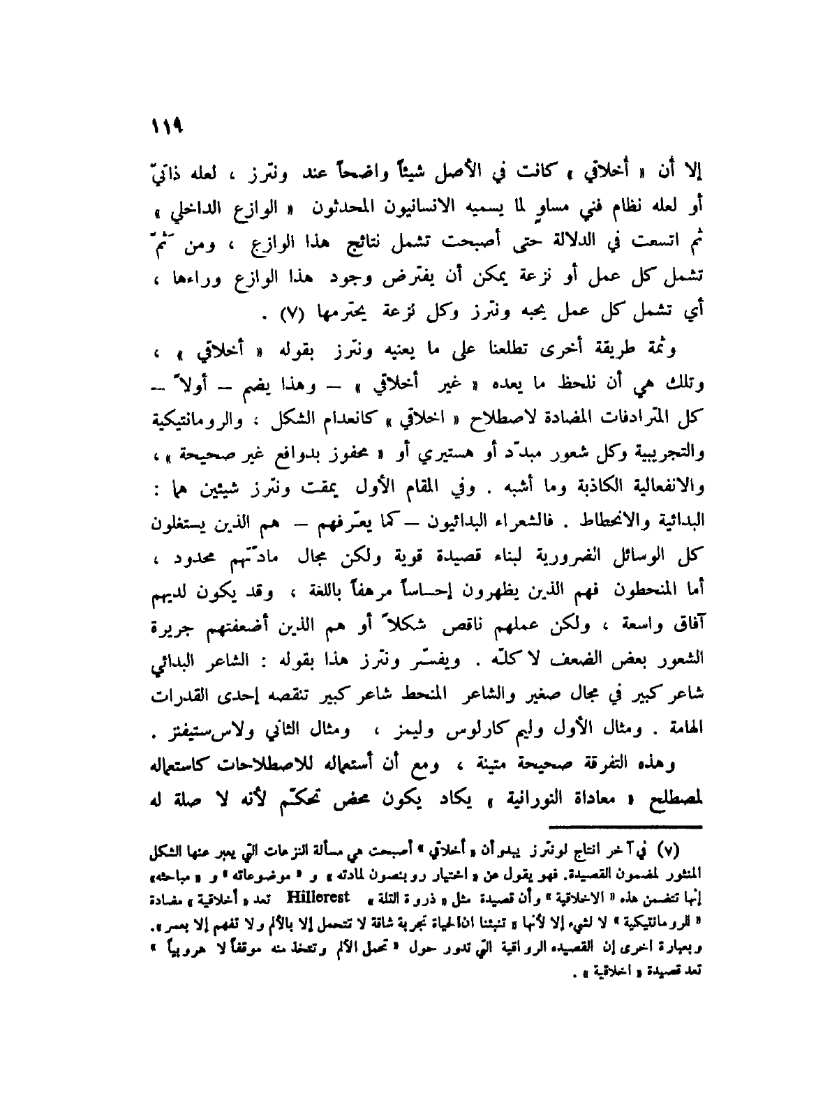 إلا أن " أخلاقي " كانت في الأصل شيئاً واضحاً عند ونترز، لعله ذاتي أو لعله نظام فني مساوٍ لما يسميه الإنسانيون المحدثون " الوازع الداخلي " ثم اتسعت في الدلالة حتى أصبحت تشمل نتائج هذا الوازع، ومن ثم تشمل كل عمل أو نزعة يمكن أن يفترض وجود هذا الوازع وراءها، أي تشمل كل عمل يحبه ونترز وكل نزعة يحترمها (1) .