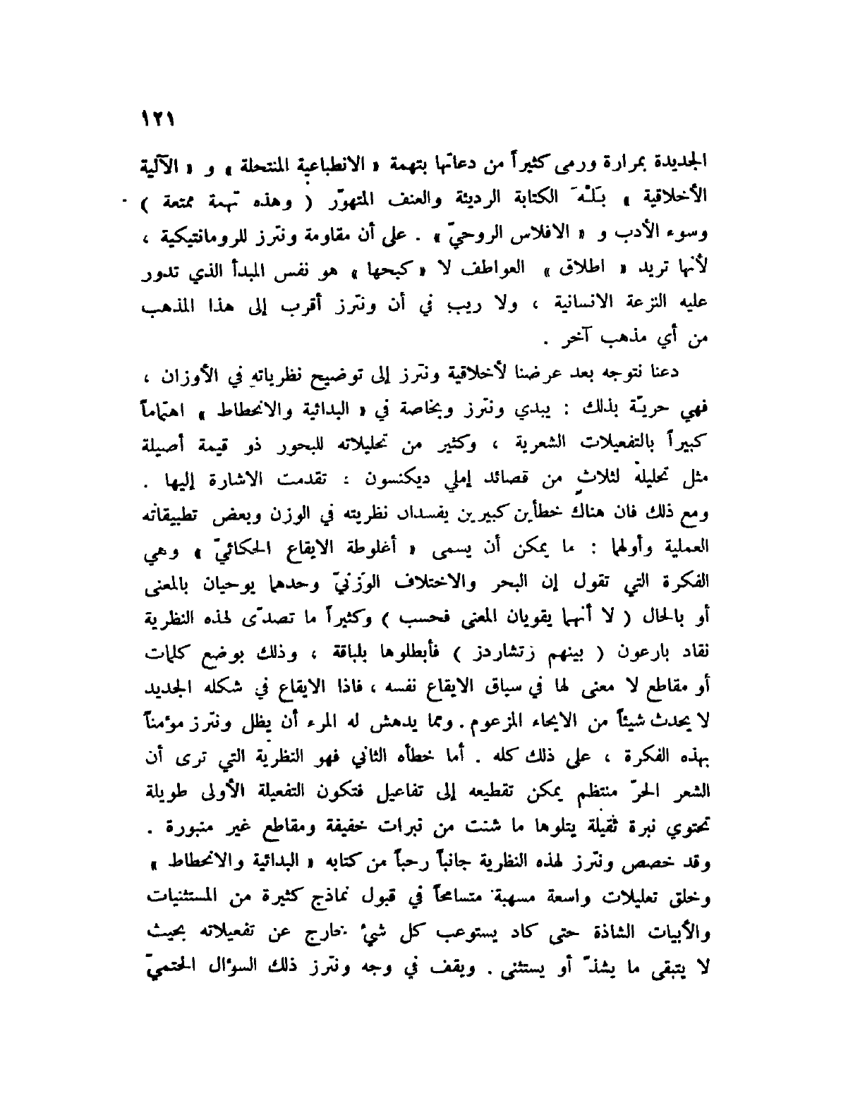 الجديدة بمرارة ورمى كثيراً دعائها بتهمة " الانطباعية المنتحلة " و " الآلية الأخلاقية " بله الكتابة الرديئة والعنف والعنف المتهور (وهذه تهمة ممتعة) وسوء الأدب و " الإفلاس الروحي ". على أن مقاومة ونترز للرومانتيكية، لأنها تريد " إطلاق " العواطف لا " كبحها " هو نفس المبدأ الذي تدور عليه النزعة الإنسانية، ولا ريب في أن ونترز أقرب إلى هذا المذهب من أي مذهب آخر.