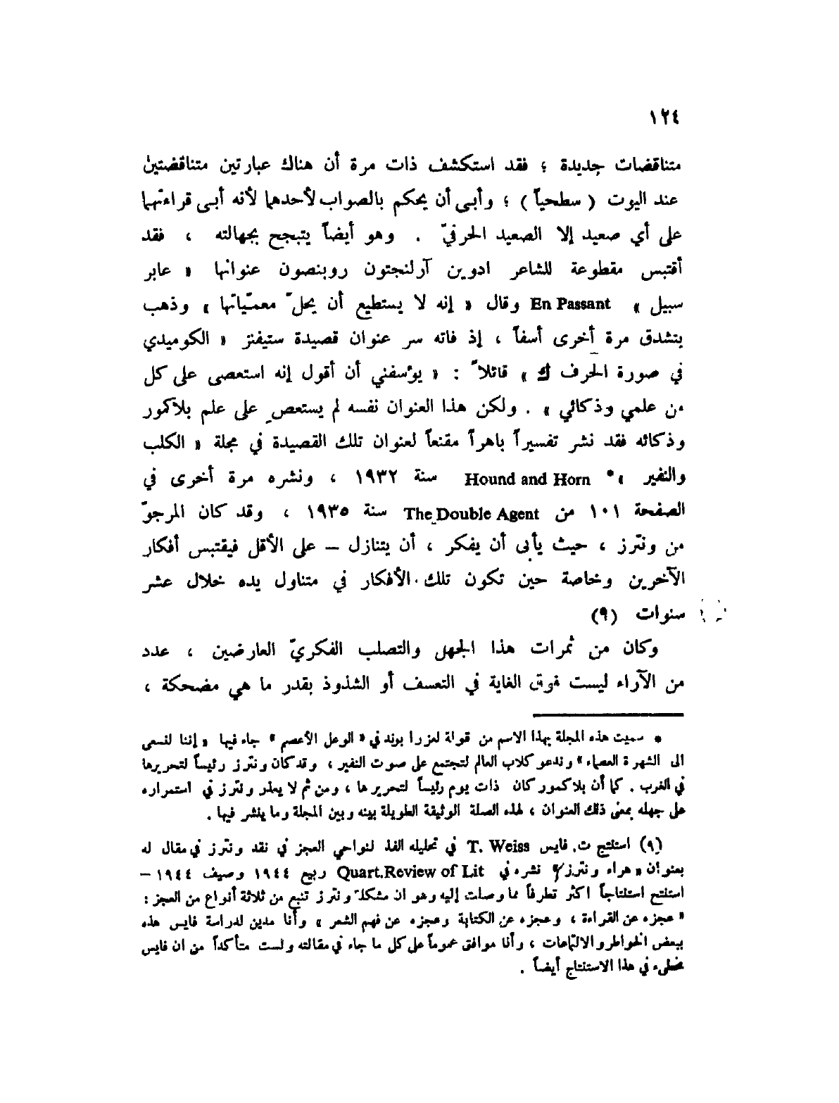 (2) استفتح ت. فايس T. Weiss في تحليله الفذ لنواحي العجز في نقد ونترز في مقال له بعنوان " هراء ونترز " نشرخ في Quart. Review of Lit ربيع 1944 وصيف 1944 - استنتج استنتاجاً أكثر تطرفاً مما وصلت إليه وهو أن مشكلة ونترز تنبع من ثلاثة أنواع من العجز: " عجزه عن القراءة، وعجزه عن الكتابة وعجزه عن فهم الشعر " وأنا مدين لدراسة فايس هذه ببعض الخواطر والالتماعات، وأنا موافق عموماً على كل ما جاء في مقالته ولست متأكداً من أن فايس مخطئ في هذا الاستنتاج أيضاً.