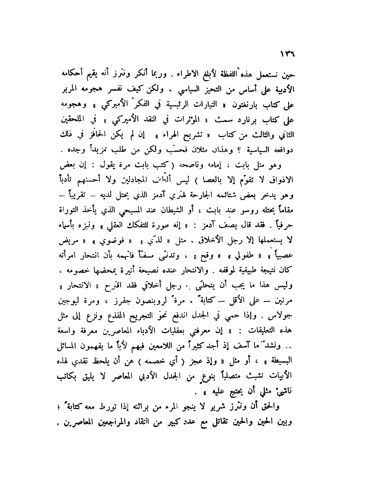 حين يستعمل هذه اللفظة لأبلغ الإطراء. وربما أنكر ونترز أنه يقيم أحكامه الأدبية على أساس من التحيز السياسي، ولكن كيف نفسر هجومه المرير على كتاب بارنغتون " التيارات الرئيسية في الفكر الأميركي " وهجومه على كتاب برنارد سمث " المؤثرات في النقد الأميركي " في الملحقين الثاني والثالث من كتاب " تشريح الهراء " إن لم يكن الحافز في ذلك دوافعه السياسية؟ وهذان مثلان فحسب ولكن من طلب مزيداً وجده.