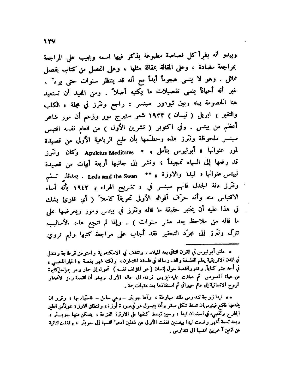 ويبدو لأنه يقرأ كل قصاصة مطبوعة يذكر فيها اسمه ويجيب على المراجعة بمراجعة مضادة، وعلى المقالة بمقالة مثلها، وعلى الفصل من كتاب بفصل مماثل. وهو لا ينسى هجوماً أبداً مع أنه قد ينتظر سنوات حتى يرد، غير أنه أحياناً ينسى تفصيلات ما يكتبه أصلا. ومن المفيد أن نستعيد هنا الخصومة بينه وبين ثيودور سبنسر: راجع ونترز في مجلة " الكلب والنفير " أبريل (نيسان) 1933 شعر ستيرج مور وزعم أن مور شاعر أعظم من بيتس. وفي أكتوبر (تشرين الأول) من العام نفسه اقتبس سبنسر ملحوظة ونترز هذه وحطمها بأن طبع الرباعية الأولى من قصيدة لمور عنوانها " أبوليوس يتأمل " (1) Apuleius Meditates وكان ونترز قد رفعها إلى السماء تمجيداً؛ ونشر إلى جانبها أربعة أبيات من قصيدة لييتس عنوانها " ليدا والإوزة " (2) Leda and the Swan. بعدئذٍ تسلم ونترز دفة الجدل فاتهم سبنسر في " تشريح الهراء " 1943 بأنه أساء الاقتباس منه وأنه حرف أقواله الأولى تحريفاً كاملاً (أي قارئ يشك في هذا عليه أن يختبر حقيقة ما قاله ونترز في ييتس ومور ويعرضها على ما قاله من ملاحظ بعد عشر سنوات) . وإذا لم تنجع هذه الأساليب تنزل ونترز إلى مجرد التحقير فقد أجاب على مراجعة كتبها وليم تروي