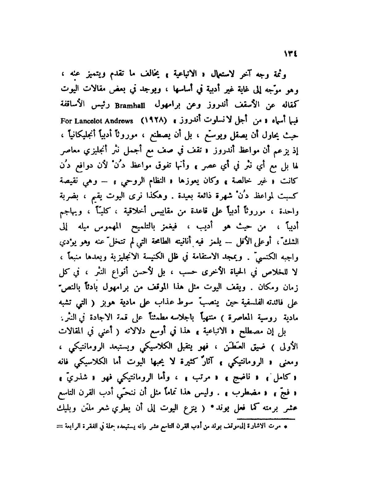 وثمة وجه آخر لاستعمال " الاتباعية " يخالف ماتقدم ويتميز عنه، وهو موجه إلى غاية أدبية في أساسها، ويوجد في بعض مقالات اليوت كمقاله عن الأسقف أندروز وعن برامهول Bramjall رئيس الأساقفة فيما أسماه " من اجل لانسلوت أندروز " (1928) For Lancelot Andrews حيث يحاول أن يصقل ويوسع، بل أن يصطنع، موروثاً أدبياً أنجليكانياص، إذ يزعم أن مواعظ أندروز " تقف في صف مع أجمل نثر إنجليزي معاصر لها بل مع أي نثر في أي عصر " وأنها تفوق مواعظ دن لأن دوافع دن كانت " غير خالصة " وكان يعوزها " النظام الروحي "؟ وهي نقيصة كسبت لمواعظ دن شهرة ذائعة بعيدة. وهذا نرى اليوت يقيم، بضربة واحدة، موروثاً أدبياً على قاعدة من مقاييس أخلاقية، كلياً، ويهاجم أديباً، من حيث هو أديب، فيغمز بالتلميح المهموس ميله إلى الشك، أو على الأقل؟ يلمز فيه أنانيته الطامحة التي لم تتخل عنه وهو يؤدي واجبه الكنسي. ويمجد الاستقامة في ظل الكنيسة الإنجليزية ويعدها منبعاً، لا للخلاص في الحياة الأخرى حسب، بل لأحسن أنواع النثر، في كل زمان ومكان. ويقف اليوت مثل هذا الموقف من برامهول بادئاً بالنص على فائدته الفلسفية حين ينصب سوط عذاب على مادية هوبز (التي تشبه مادية روسية المعاصرة) منتهياً باجلاسه مطمئناً عل قمة الإجادة في النثر.