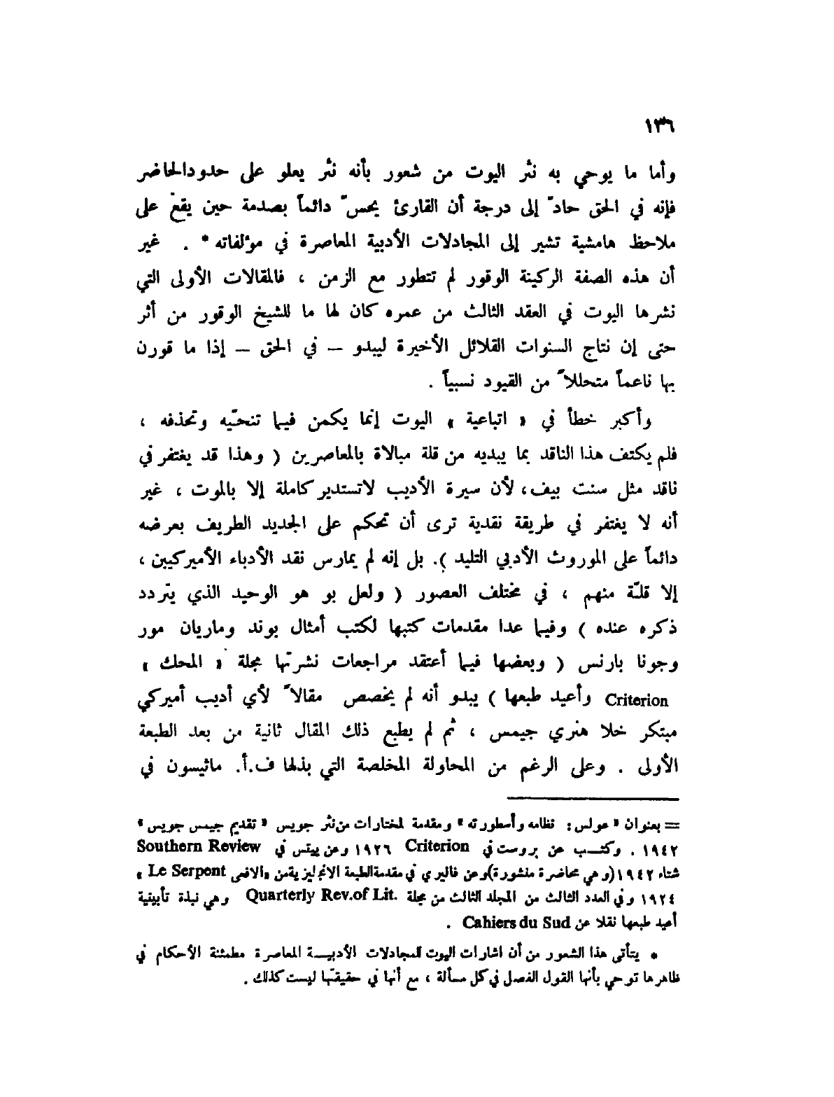 (1) يتأتى هذا الشعور من أن إشارات اليوت للمجادلات الأدبية المعاصرة مطمئنة الأحكام في ظاهرها توحي بأنها القول الفصل في كل مسألة، مع أنها في حقيقتها ليست كذلك.