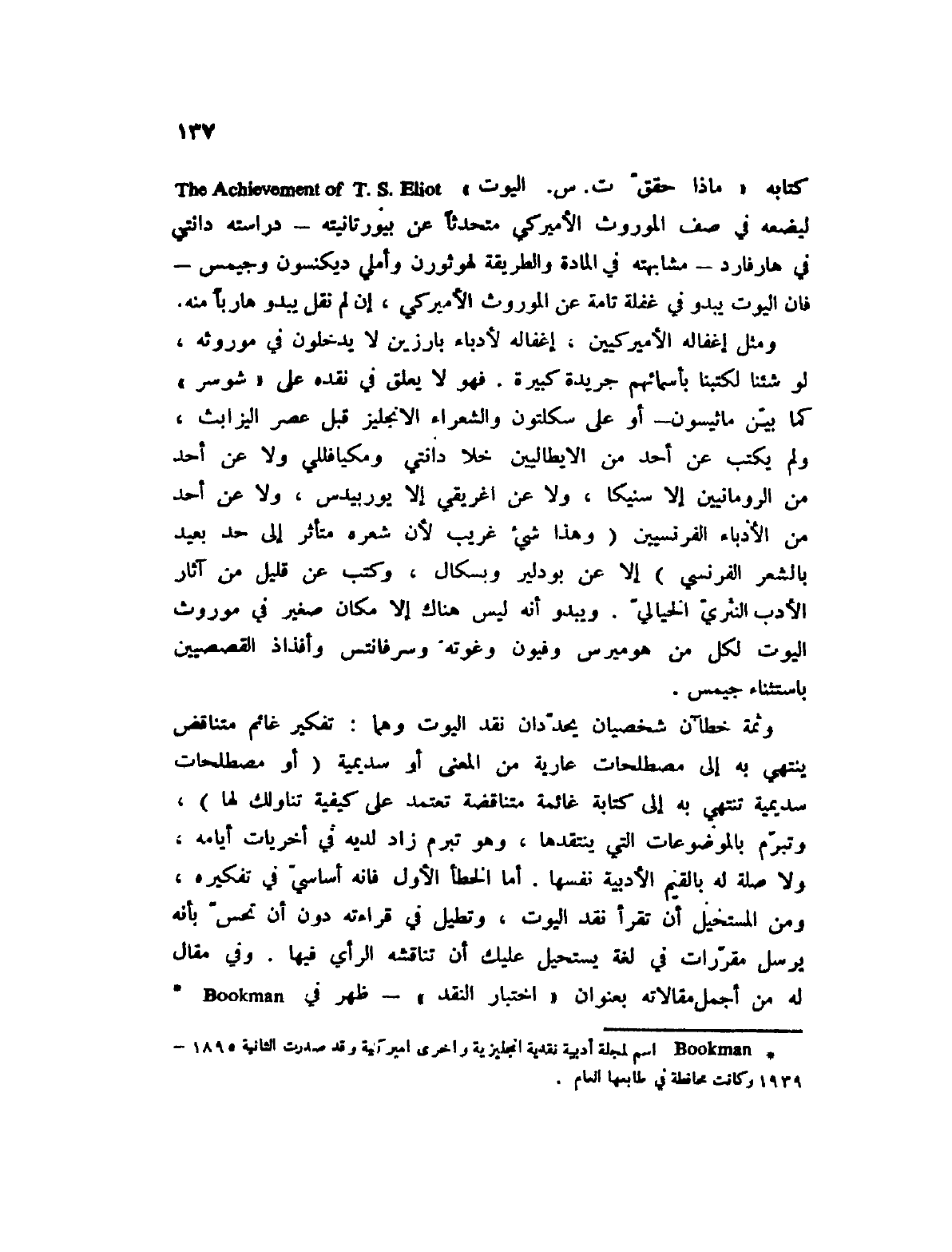 كتابه " ماذا حقق ت. س. اليوت " The Achivement of T. S. Eliot ليضعه في صف الموروث الأميركي متحدثاً عن بيورتانيته؟ دراسته دانتي في هارفارد؟ مشابهته في المادة والطريقة لهوثورن وأملي ديكنسون وجيمس؟ فإن اليوت يبدو في غفلة تامة عن الموروث الأميركي، إن لم نقل يبدو هارباً منه.