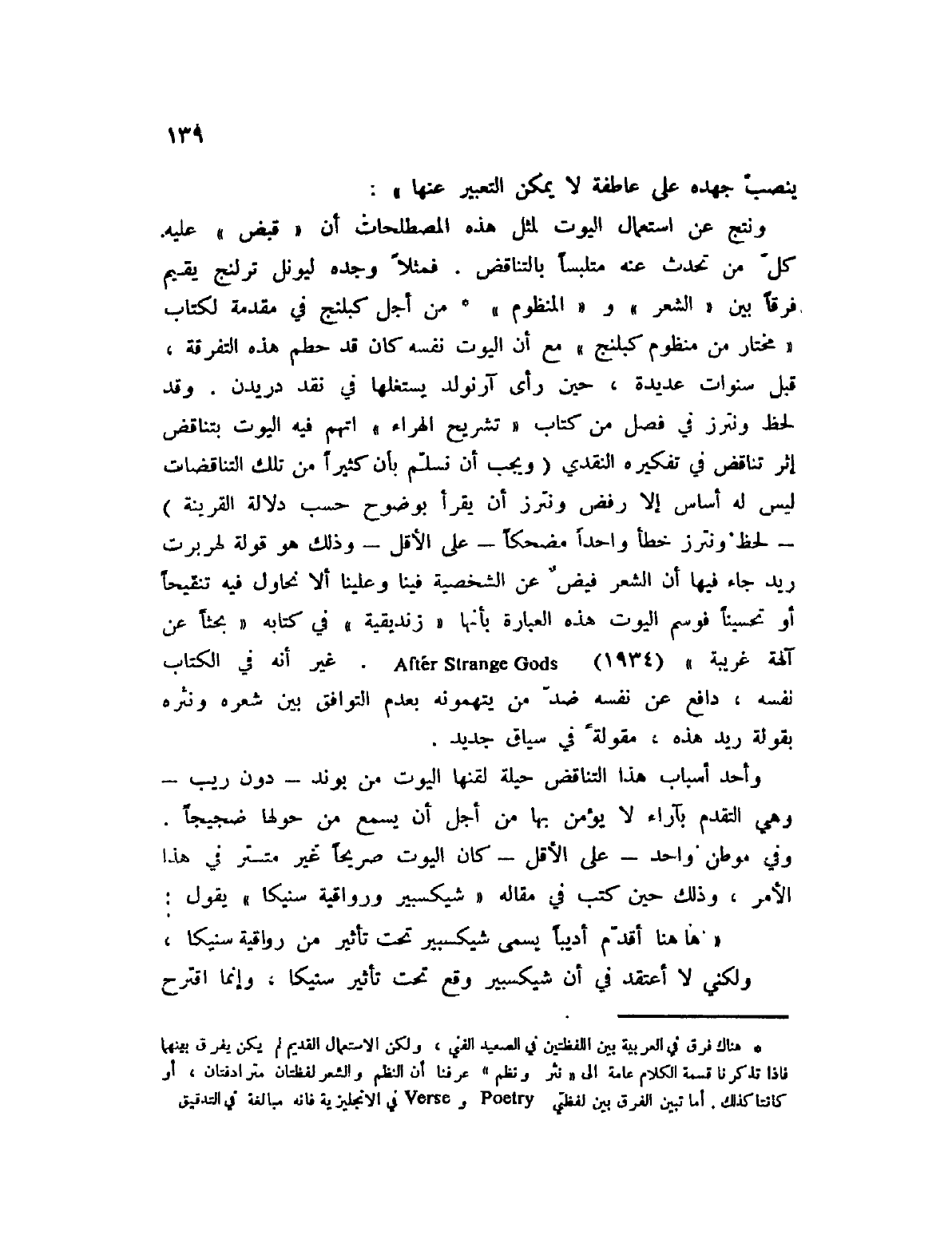 ونتج عن استعمال اليوت لمثل هذه المصطلحات أن " قبض " عليه كل من تحدث عنه متلبساً بالتناقض. فمثلاً وجده ليونل ترلنج يقيم فرقاً بين " الشعر " و " المنظوم " (1) من أجل كبلنج كان قد حطم هذه التفرقة، قبل سنوات عديدة، حين رآى آرنولد يستغلها في نقد دريدن. وقد لحظ ونترز في فصل من كتاب " تشريح الهراء " اتهم في اليوت بتناقض إثر تناقض في تفكيره النقدي (ويجب أن نسلم بأن كثيراً من تلك التناقضات ليس له أساس إلا رفض ونترز أن يقرأ بوضوح حسب دلالة القرينة) ؟ لحظ ونترز خطأ واحداً مضحكاً؟ على الأقل؟ وذلك هو قولة لهربرت ريد جاء فيها أن الشعر فيض عن الشخصية وفينا وعلينا ألا تحاول فيه تنقيحاً أو تحسيناً فوسم اليوت هذه العبارة بأنها " زنديقية " في كتابه " بحثاً عن آلهة غريبة " (1934) After Strange Gods. غير أنه في الكتاب نفسه، دافع عن نفسه ضد من يتهمونه بعدم التوافق بين شعره ونثره بقولة ريد هذه، مقولة في سياق جديد.